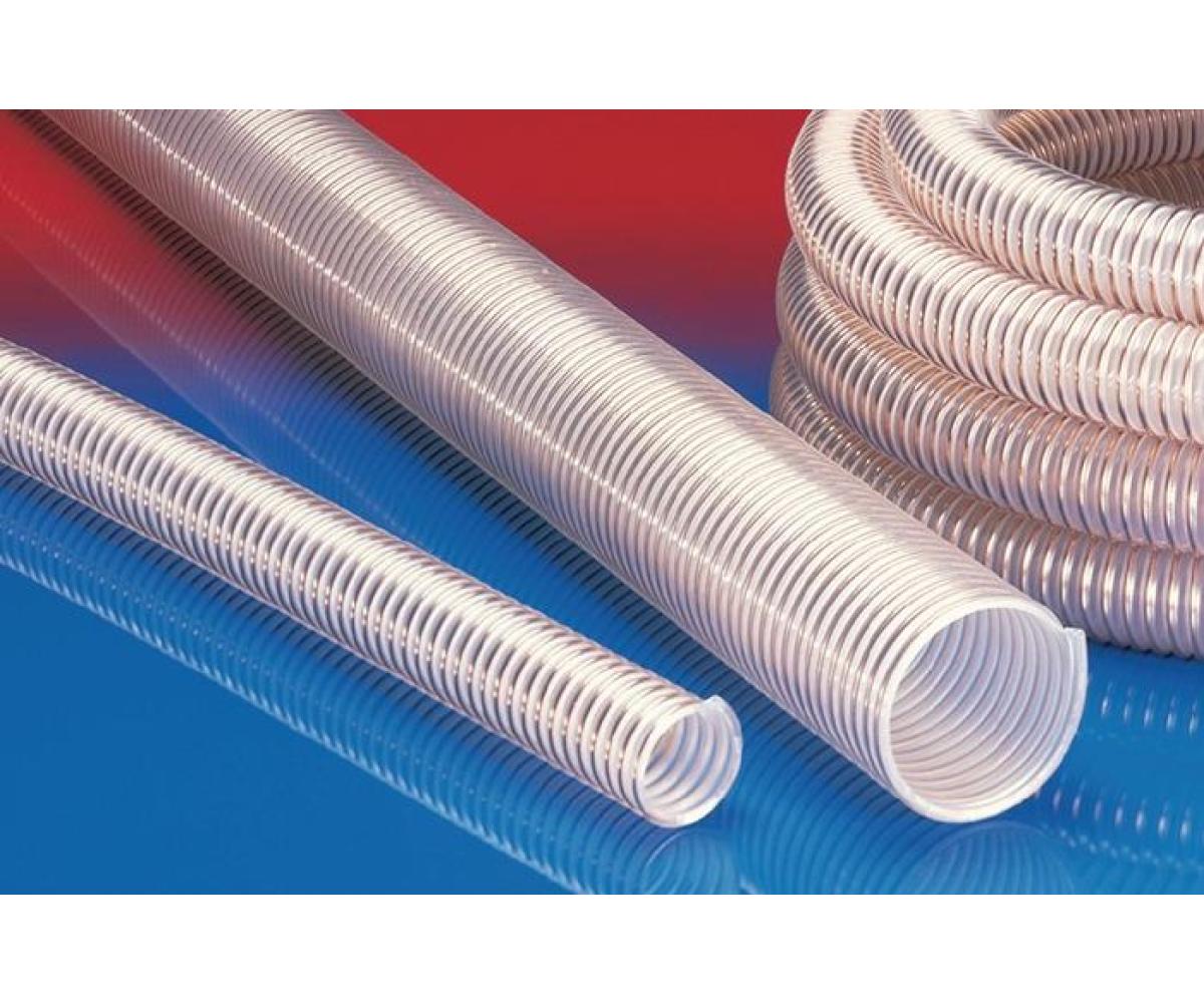 Anwendungen: Schlauch für hohen Durchsatz an extrem abrasivem Schüttgut, Granulat, Stein, Kunststoffindustrie: Granulat-, Vakuum- und Saugförderer, Dosiersystem, Big-Bag Befüllung/Entleerung, Schredder, Mühle, Extruder, Spritzgußmaschine, Saug- und Trockenfahrzeugfahrzeug: Dachbekiesung, Industriereinigung, Kraftwerksreinigung, Saugbagger, explosionsgefährdeter Bereich, Landwirtschaft: pneumatische Getreideförderer, Betonpumpe: Auslaufschlauch, Bauindustrie: Gesteinbohrmaschine, Rohstoff Förderschlauch für Sand, Quarz, Kies, Scherben, Späne, Verdichter/ Kompressor, Seitenkanalverdichter, Vakuum- und Druckpumpe, Papierindustrie/ Verpackungsmaschine: Randstreifenabsaugung, Oberflächenbearbeitung: Kugel- und Sandstrahlmittel Rückführung z. B. an Strahlkabine, Schiffswerft, Stripper, Boden-Fräse, Schleifmaschine, Silofahrzeug/Tankwagen: Silo Befüllung und Entleerung, Förderung von Holzpellets, Kunststoffgranulat und -pulver Eigenschaften: superschwere Ausführung, extrem abriebfest durch gezielte Verstärkung unter dem Draht und kleine Schlauchsteigung, sehr hohe Druck-, Vakuum- und Scheiteldruckfestigkeit, mikrobenfest, gute Öl-, Benzin- und Chemikalienbeständigkeit, sehr gute Kälteflexibilität, Wandung permanent antistatisch: Durchgangswiderstand und Oberflächenwiderstand Konstruktion: 1. in der Wandung fest eingegossener Federstahldraht, 2. Wandung: permanent-antistatisches Premium Ester-Polyurethan (Pre-PUR ® ), 3. Wandstärke ca. 2,0 - 2,5 mm, 4. Verstärkung der primären Verschleißzonen Temperaturbereich: -40 °C bis +90 °C (kurzz. +125 °C) Liefervarianten: weitere Ausführungen, Abmessungen und Längen auf Anfrage lieferbar