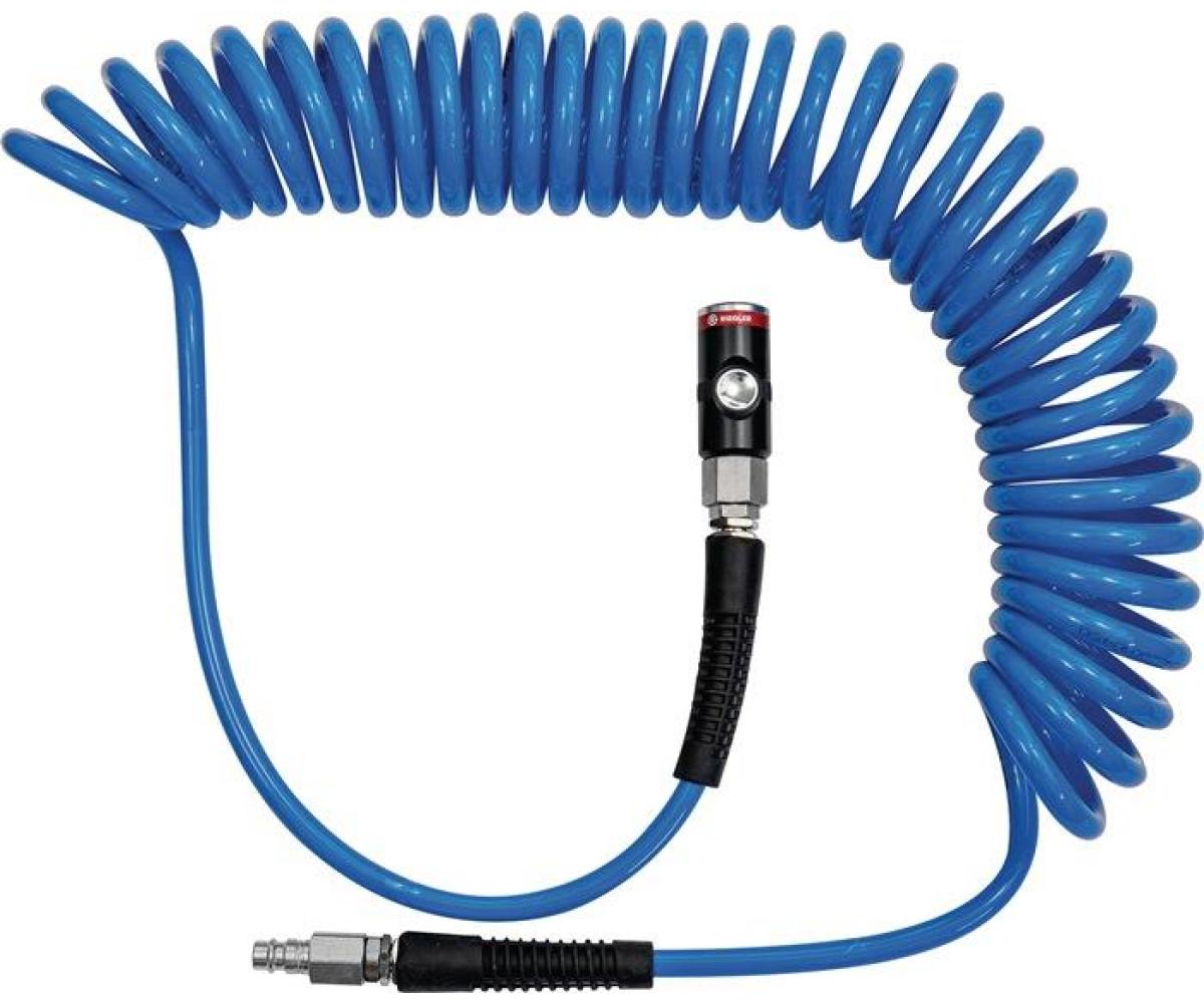 Polyurethan · verfügt über eine ähnliche Rückholkraft wie der herkömmliche Polyamid-Spiralschlauch, neigt jedoch weniger zur Schleifenbildung und hat eine deutlich höhere Abriebfestigkeit · die Gefahr des Verkratzens von lackierten oder empfindlichen Oberflächen ist somit geringer · extrem flexibel und knickfest