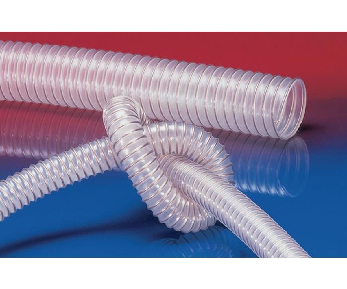 Anwendungen: flexibler Schlauch für abrasives Pulver, Schüttgut, Granulat, Gase, Förderung von trockene und gefrorenen Lebensmittel und Pharmazeutika, Vakuum- und Saugförderer, Dosiersystem, Mischer, Trockner, Verpackungsmaschine, Big-Bag Befüllung/Entleerung, Mühle, Industrie- und Staubsauger Eigenschaften: mittelschwere Ausführung, hoch abriebfest, Zulassung nach EU-Verordnung 10/2011 sowie EG 1935/2004 und der neuesten EU-Verordnung 2015/174 durch ein unabhängiges Prüfinstitut für den gesamten Schlauch, Polyurethan lebensmittelecht nach: FDA 21 CFR 177.2600 und 178.2010, geruchs- und geschmacksfrei, mikroben- und hydrolysefest, gute Öl-, Benzin- und Chemikalienbeständigkeit, sehr gute Kälteflexibilität, schwerentflammbar nach: UL94-HB, RoHS konform, Zulassung nach EU-Verordnung 10/2011 (Lebensmittelsimulanzien A, B, C oder E und D2) sowie EG 1935/2004 – Herstellungsprozess gemäß GMP EC 2023/2006 Konstruktion: 1. in der Wandung fest eingegossener Federstahldraht, 2. Wandung: spezial Premium Ether-Polyurethan (Pre-PUR ® ), 3. Wandstärke ca. 1,0 mm Temperaturbereich: -40 °C bis +90 °C (kurzz. +125 °C) Liefervarianten: weitere Ausführungen, Abmessungen und Längen auf Anfrage lieferbar