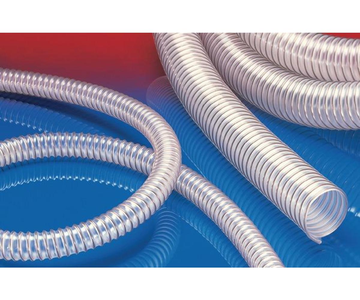 Anwendungen: flexibler Schlauch für hohen Durchsatz an abrasivem Pulver, Schüttgut, Granulat und für Gase, Förderung von trockene und gefrorenen Lebensmittel und Pharmazeutika, Vakuum- und Saugförderer, Dosiersystem, Tablettenpresse, Mischer, Trockner, Verpackungsmaschine, Big-Bag Befüllung/Entleerung, Mühle, Flugzeug, Zug, Boot: Toilettenentsorgung, Industrie- und Staubsauger, Landwirtschaft: pneumatische Getreideförderer, Tierstall: Futtermittelförderung, -anlage und -transport, Papierindustrie: Schmutzwasser, Abluft, Industriewaschmaschine: Waschwasserschlauch Eigenschaften: schwere Ausführung, hoch abriebfest, erhöhte Druck- und Vakuumfestigkeit, Zulassung nach EU-Verordnung 10/2011 sowie EG 1935/2004 und der neuesten EU-Verordnung 2015/174 durch ein unabhängiges Prüfinstitut für den gesamten Schlauch, Polyurethan lebensmittelecht nach: FDA 21 CFR 177.2600 und 178.2010, geruchs- und geschmacksfrei, mikroben- und hydrolysefest, gute Öl-, Benzin- und Chemikalienbeständigkeit, sehr gute Kälteflexibilität, schwerentflammbar nach: UL94-V2, gemäß DIN 26057 Typ 3, RoHS konform, REACH konform, Zulassung nach EU-Verordnung 10/2011 (Lebensmittelsimulanzien A, B, C oder E und D2) sowie EG 1935/2004, Herstellungsprozess gemäß GMP EC 2023/2006 Konstruktion: 1. in der Wandung fest eingegossener Federstahldraht, 2. Wandung: spezial Premium Ether-Polyurethan (Pre-PUR ® ), 3. Wandstärke ca. 1,4 - 1,5mm Temperaturbereich: -40 °C bis 90 °C, kurzzeitig bis 125 °C Liefervarianten: weitere Ausführungen, Abmessungen und Längen auf Anfrage lieferbar