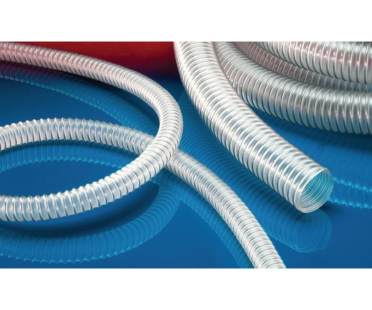Anwendungen: flexibler Schlauch für hohen Durchsatz an abrasivem Pulver, Schüttgut, Granulat und für Gase, Förderung von trockene und gefrorenen Lebensmittel und Pharmazeutika, Vakuum- und Saugförderer, Dosiersystem, Tablettenpresse, Mischer, Trockner, Verpackungsmaschine, Big-Bag Befüllung/Entleerung, Mühle, Industrie- und Staubsauger, explosionsgefährdeter Bereich, Tierstall: Futtermittelförderung, -anlage und -transport Eigenschaften: schwere Ausführung, hoch abriebfest, erhöhte Druck- und Vakuumfestigkeit, Zulassung nach EU-Verordnung 10/2011 sowie EG 1935/2004 und der neuesten EU-Verordnung 2015/174 durch ein unabhängiges Prüfinstitut für den gesamten Schlauch, Polyurethan lebensmittelecht nach: FDA 21 CFR 177.2600, geruchs- und geschmacksfrei, mikroben- und hydrolysefest, gute Öl-, Benzin- und Chemikalienbeständigkeit, sehr gute Kälteflexibilität, Wandung permanent antistatisch: Durchgangswiderstand und Oberflächenwiderstand Konstruktion: 1. in der Wandung fest eingegossener Federstahldraht, Spirale: Edelstahldraht (INOX), 2. Wandung: permanent-antistatisches Premium Ether-Polyurethan (Pre-PUR ® ), 3. Wandstärke 1,4 - 1,5mm Temperaturbereich: -40 °C bis +90 °C Liefervarianten: weitere Ausführungen, Abmessungen und Längen auf Anfrage lieferbar