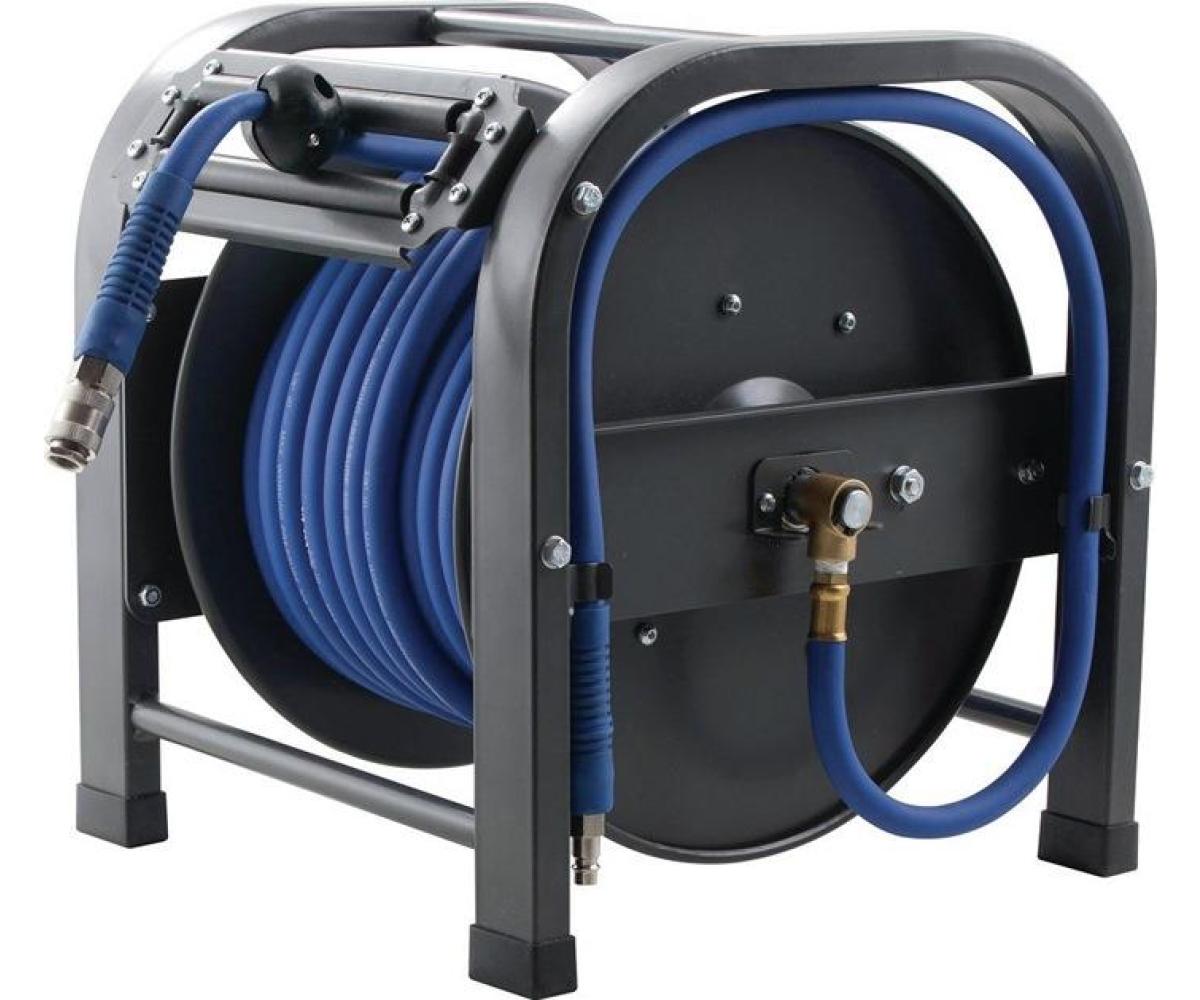 30 Meter Montage-Schlauchtrommel mit automatischem Rücklauf · mit hochflexiblem PU MESH Gewebeschlauch · mit Knickschutz an den Enden · stabiler Stahlblechrahmen, pulverbeschichtet · Blockiervorrichtung aus Stahl, sehr robust · Arretierung verhindert den ungewollten automatischen Rücklauf · fertig montiert und sofort einsatzfähig