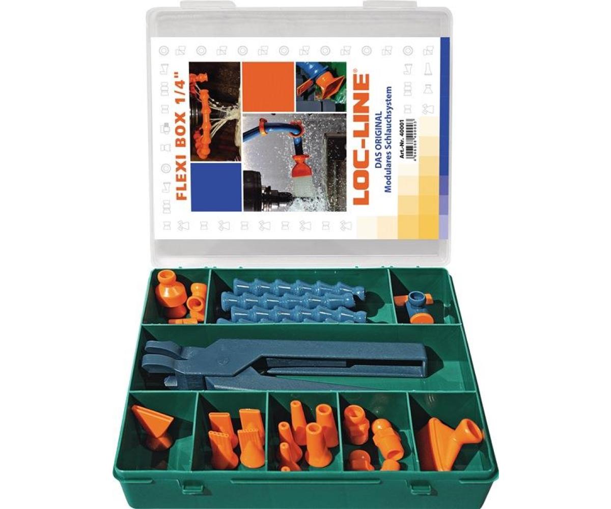 Kühlmittelschlauchset · Gr.1/4 Zoll · 29tlg.LOC-LINE · Art.-Nr. 4000 879 841 bestehend aus: 8 Stück Gelenkschläuche, je 90 mm 2 Stück Runddüsen 1,5 mm Ø 2 Stück Runddüsen 3 mm Ø 2 Stück Runddüsen 6 mm Ø 1 Stück Breitstrahldüse 25 mm 1 Stück Flachdüse 12x1 mm 1 Stück Flachdüse 12x1,5 mm 1 Stück 5-Lochdüse 1,5 mm Ø 1 Stück 7-Lochdüse 1 mm Ø 1 Stück Gelenkduschdüse 16x1 mm Ø 1 Stück Klemmring mit Schraube 1 Stück Y-Abzweig 2 Stück Gewindenippel NPT R 3,18 mm (1/8") 2 Stück Gewindenippel NPT R 6,35 mm (1/4") 1 Stück Absperrventil mit Gelenkanschluss 1 Stück Rückschlagventil 1 Stück Montagezange ·