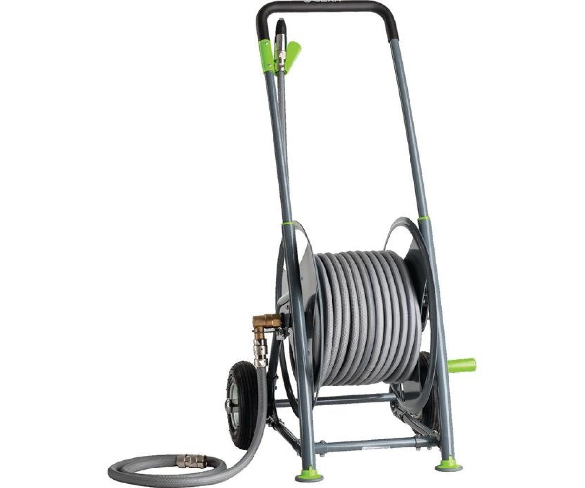 hochwertige, pulverbeschichtete und standfeste Stahlkonstruktion · griffige Luftbereifung · Softgrip und Winkeldreharmatur aus Messing · bestückt mit 25 m Geka 110 Wasserschlauch 1/2? (13 mm), Original Geka plus Stecksystem, Spritzdüse und Anschlussset 1,5 m für den Wasserhahn · inkl. Hahnstecker G 3/4? · vormontiert · Temperaturbereich Schlauch: -10 °C bis +50 °C · Temperaturbereich Schlauchwagen: +4 bis +60 °C
