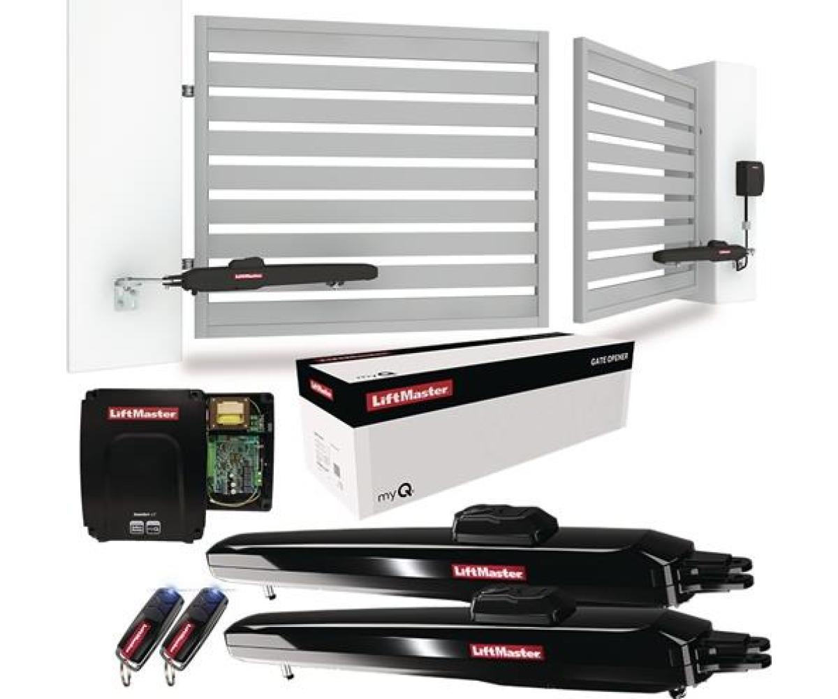 smartes Doppelflügeltoröffner-Kit · Schraubenstil 24V DC Antriebskit für Wohn-Doppelflügelschwingtore mit max. 300 kg Flügelgewicht oder 3 m Flügelbreite (max. 6 m Öffnungsbreite mit 2 Flügeln) · myQ bereit für die Smartphone-Steuerung, erfordert LiftMaster myQ Gateway 828EV und ein Paar Lichtschranken 772E-01 · max. Toröffnung von 120° · Torgewicht bei max. Flügelbreite: 300kg / 2m, 250kg / 2,5m, 200kg / 3m Öffnungszeit 90°: ? 15-18s · max. Zyklen 10/30 h/Tag · Motoren IP44, Steuerplatine IP65 · Energieeinsparung durch niedrigen Standby von 4,2 W