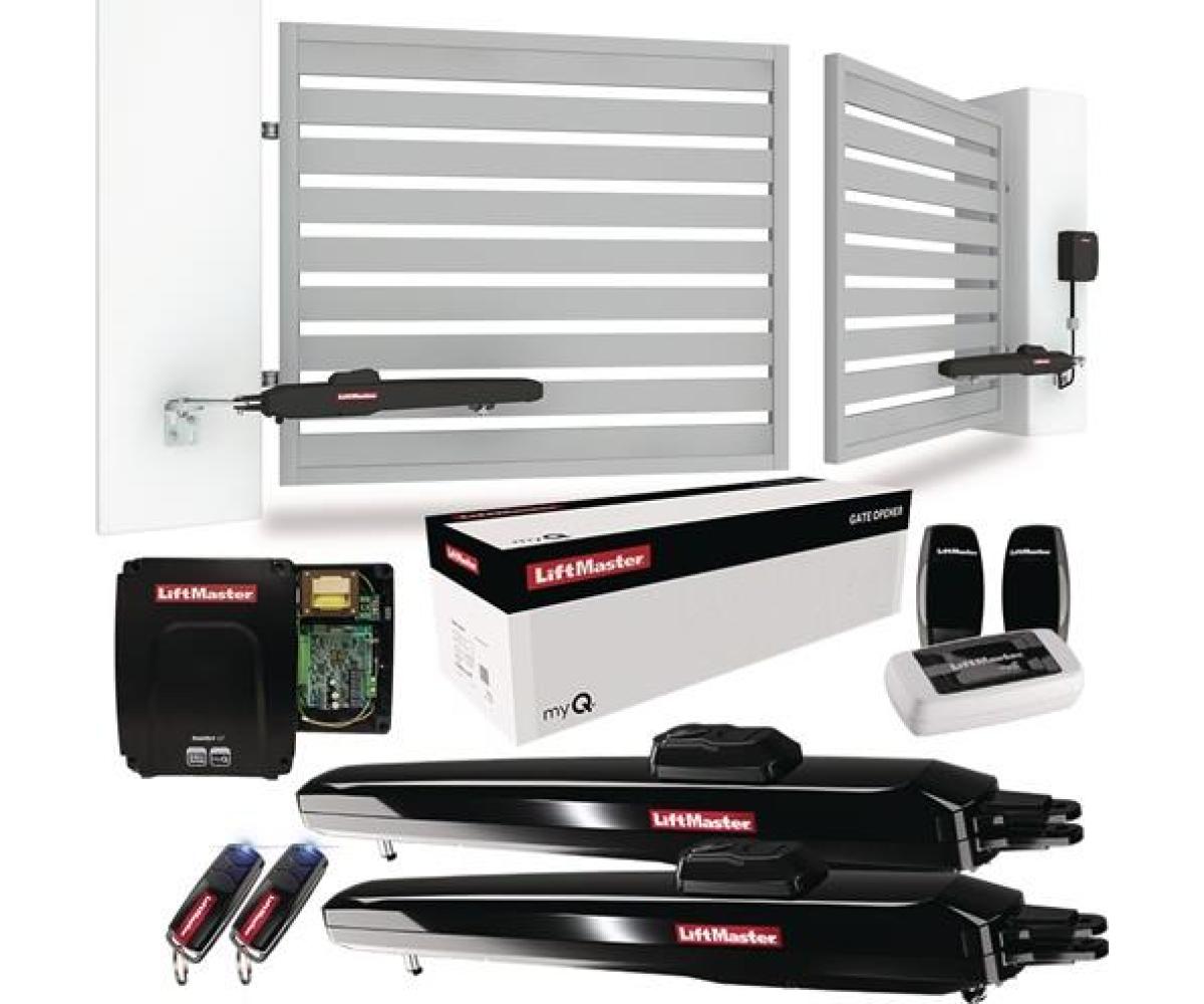 smartes Doppelflügeltoröffner-Kit, Smart-Paket · Schraubenstil 24V DC Antriebskit für Wohn-Doppelflügelschwingtore mit max. 300kg Flügelgewicht oder 3 Meter Flügelbreite (max. 6 Meter Öffnungsbreite mit 2 Flügeln) · max. Toröffnung von 120° · Torgewicht bei max. Flügelbreite: 300kg / 2m, 250kg / 2,5m, 200kg / 3m · Öffnungszeit 90°: ?15-18s Max. Zyklen h/Tag: 10/30 · myQ-Version für die Smartphone-Steuerung durch das im Lieferumfang enthaltene LiftMaster myQ Gateway 828EV und ein Paar Lichtschranken 772E-01 · Motoren IP44, Steuerplatine IP65 · Energieeinsparung durch niedrigen Standby von 4,2 W
