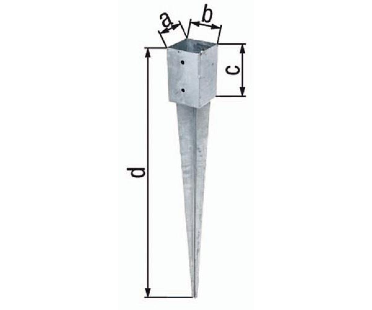 Weitere technische Eigenschaften · Oberfläche: feuerverzinkt · Maß c: 150mm · Maß d: 750mm · Maß a: 91mm · Maß b: 91mm · Einschlag-Bodenhülse · a91xb91xc150xd750mm STA · roh TZN GAH ·