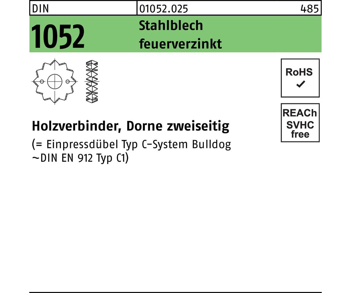 DIN 1052 Stahlblech feuerverzinkt Holzverbinder · Dorne zweiseitig - Abmessung: 75 M 16-M 24 VE=S (100 Stück) Weitere technische Eigenschaften: · Material: Stahlblech · Durchmesser: 75 mm · Form: Ohne Formfangabe · Gruppencode: 01052.025