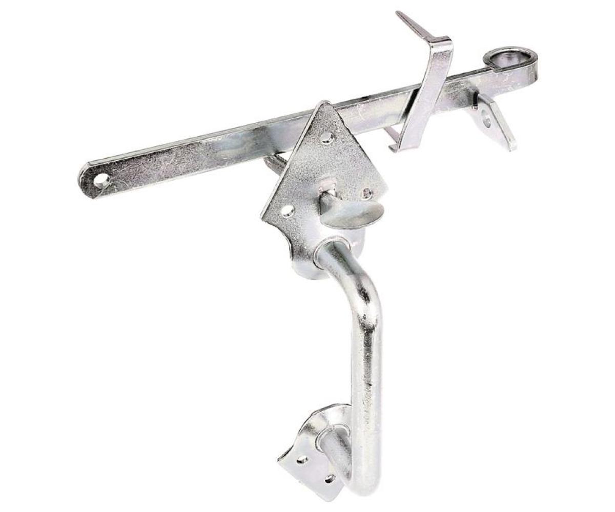 für Flechtzaun-Tore und leichte Holztore Material: Stahl roh, Oberfläche: galvanisch verzinkt, dickschichtpassiviert zum Einschlagen bestehend aus: je einem Klinkgriff, Klinkhebel, Klinkkrampe und Klinkhaken. Klinkkrampe und Klinkhaken sind zum Einschlagen