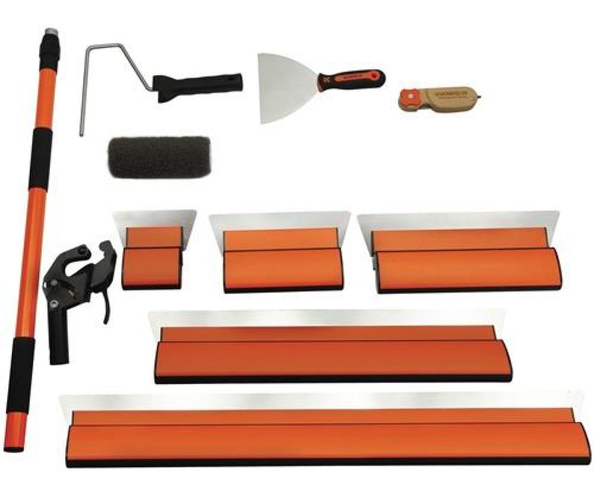 Lieferumfang: 5 Glättespachtel mit flexibler Edelstahlklinge (15 cm, 25 cm, 35 cm, 50 cm, 80 cm) 1 Trockenbaumesser (152 mm) 1 Rollspachtel (18 cm) 1 Teleskopstange (verstellbar von 75–135 cm) 1 Universalmesser mit Zusatzfunktion (z. B. zum Öffnen, Schaben, Reinigen) 1 textile TransporttascheTechnische Daten