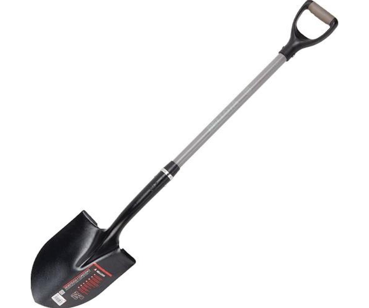 gestanzte, spitze Schaufel zum Entleeren von Erde · hergestellt aus speziellem wärmebehandeltem Stahl, um die Lebensdauer des Werkzeugs zu verlängern · verfügt über einen hohlen Glasfasergriff und einen breiten Ring aus zwei Materialien für einen bequemen Halt des Werkzeugs · extra breite Grifffläche für maximalen Komfort