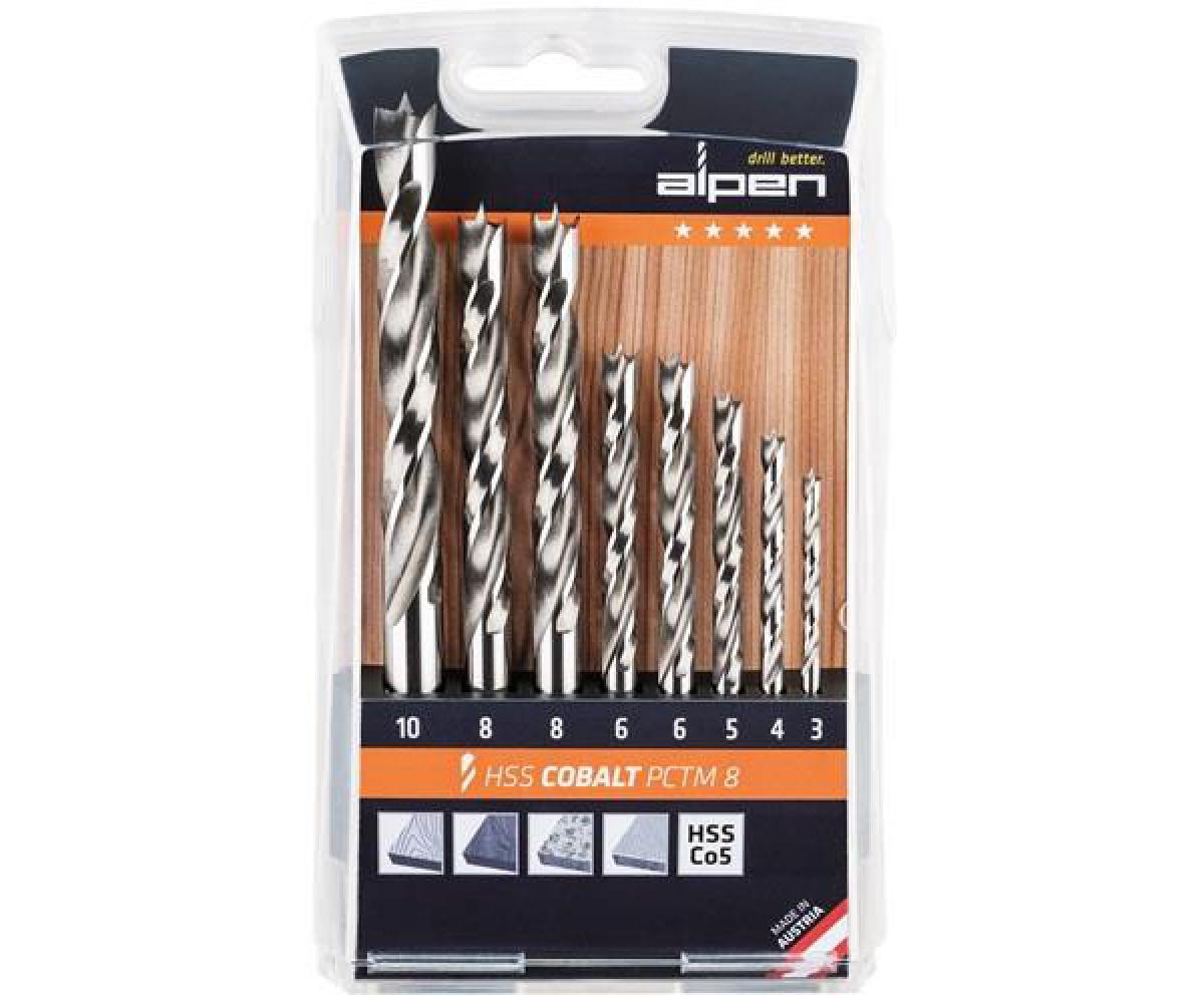 Holzspiralbohrersatz PCTM · 8-tlg.D.3,4,5,2x6,2x · 8,10mm HSS-Co5 ALPEN · Besonderer Produktvorteil: hitzebeständig bis 650°C besonders geeignet für Terassendielen ·