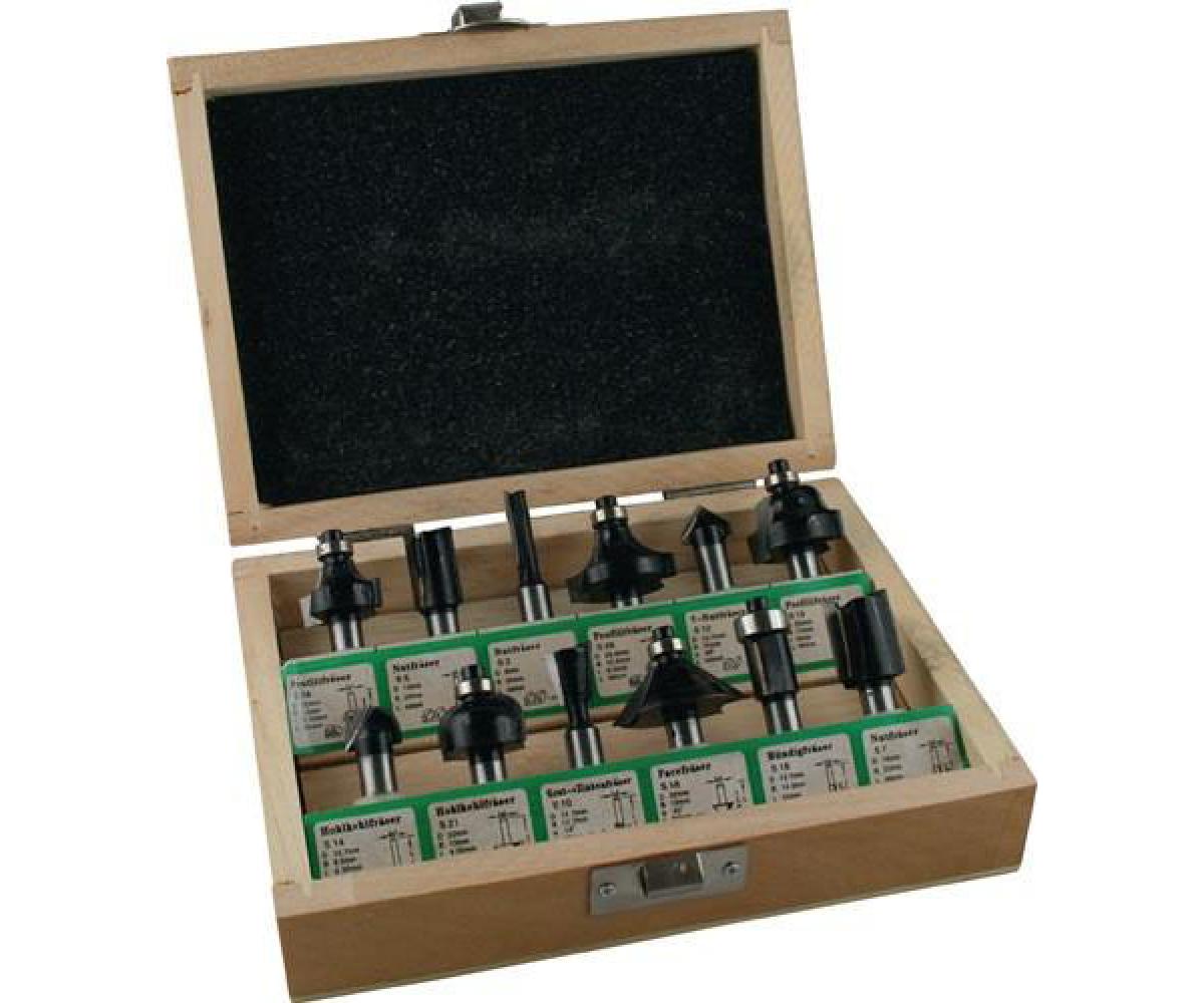 Inhalt: 1 St. Hohlkehlfräser Ø 12,7 mm, Radius 6,3 mm 1 St. Hohlkehlfräser Ø 22 mm, Radius 6,3 mm 1 St. Grat- und Zinkenfräser Ø 12,7 mm, 14° 1 St. Fasenfräser Ø 32 mm, 45° 1 St. Bündigfräser 12,7 mm je 1 St. Nutfräser 16 / 12 / 6 mm 1 St. Abrundfräser 22 mm, 6,3 mm 1 St. Abrundfräser 28,6 mm, 9,5 mm 1 St. V-Nutfräser 12,7 mm, 90° 1 St. Profilfräser 25 mm, 4 mm Lieferung im HolzkastenTechnische Daten