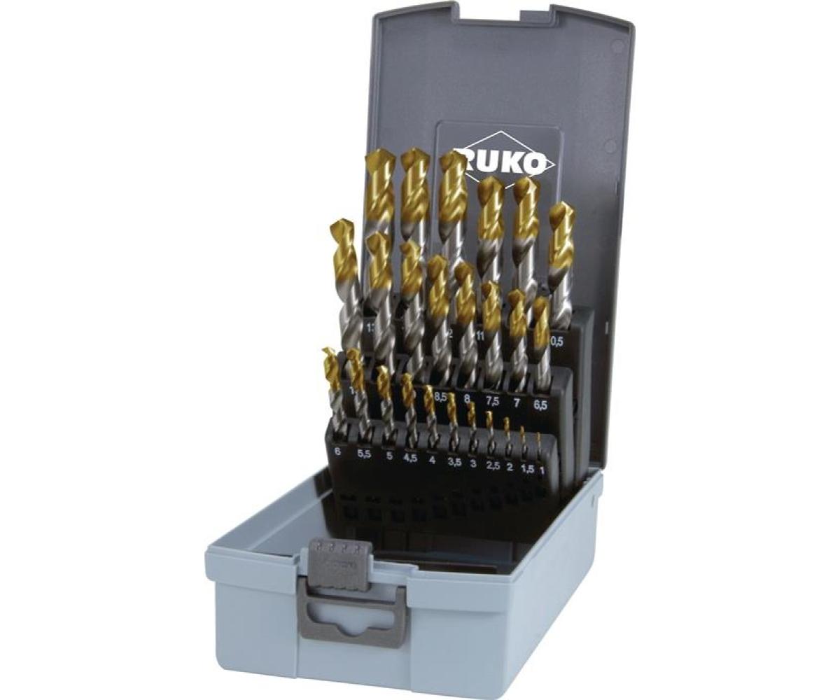 Weitere technische Eigenschaften · Qualität: profilgeschliffen · Ausspitzung: Kreuzanschliff DIN 1412 C ab Ø 2 mm · Hauptanwendung: Stahl < 900 N/mm² · Kern: normal · Nutprofil: normal · Oberfläche: TiN · Ø-Toleranz: h8 · Spiralwinkel: 25 - 30° · Spitzenanschliff: Kegelmantelanschliff · Verpackungseinheit: 1 · Spiralbohrersatz DIN 338 · TypN D.1-13x0,5mm HSS · TiN-Kopfbeschichtet ·