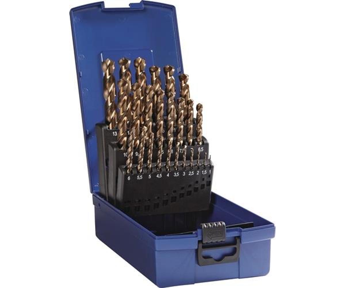 Weitere technische Eigenschaften · Qualität: profilgeschliffen · Spiralbohrersatz DIN 338 · Typ VA D.1-13x0,5mm · HSS-Co5 · AT · in schlag- und bruchfester Kunststoffkassette ·