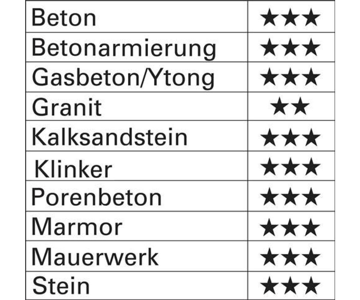 3-Flügel-Turbinenschneide für erhöhte Effektivität beim Materialabtrag · verstärkte Kraftübertragung beim Bohren durch wellenförmiges Kopfdesign · höchste Lebensdauer dank extrem verschleißbeständiger Ein-Phasen-Hartmetalllegierung · hält selbst Armierungstreffern stand · äußerst schneller Bohrmehltransport ohne Verpuffung aufgrund breiter Wendelform · vibrationsoptimierte Dreifach-Wendel · zertifiziert durch die Prüfgemeinschaft Mauerbohrer (PGM) nach Anforderungen des Deutschen Instituts für Bautechnik (DIBt) Einsatzbereich: Beton auch härtester Güten, armierter Beton, Naturstein, Mauerwerk, Klinker