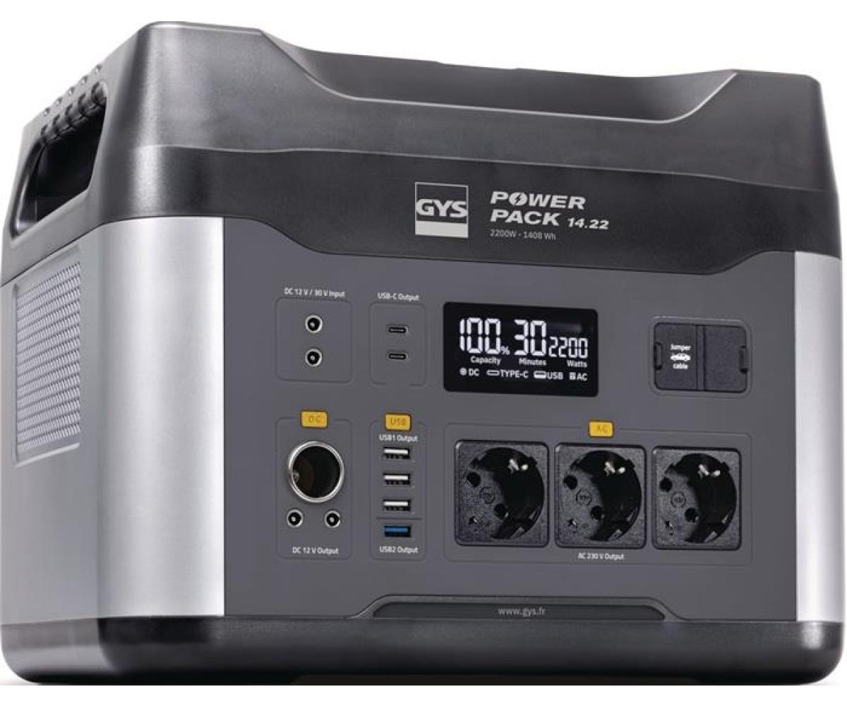 tragbare Stromquelle, die einen Li-Ionen-Akku (LiFePO4) und einen Pure Sine Wave (PSW) Wechselrichter kombiniert, um alle Arten von elektrischen Geräten zu betreiben oder aufzuladen (2000 W) · gibt sowohl 12 V Gleichspannung als auch eine 230 V(AC) Stromversorgung · Ausgang: 3x 230V / 50Hz / 500W (Steckdose), 12V / 12A (Zigarettenanzünder), 2x Typ C, 1x USB- quickcharge, 3x USB-dual · Startstrom: 500 A (1V/C), Spitzenstrom: 1000 A · Nutzungsdauer: 22h (50W), 11h (100W), 4:30h (250W), 2:15h (500W) · „Booster“-Funktion zum Starten von Fahrzeugen mit entladenen 12-V-Bleiakkus (flüssig, Gel, AGM, Start&Stop) und Lithium LiFePO4-Batterien (I1V/C: 500 A)