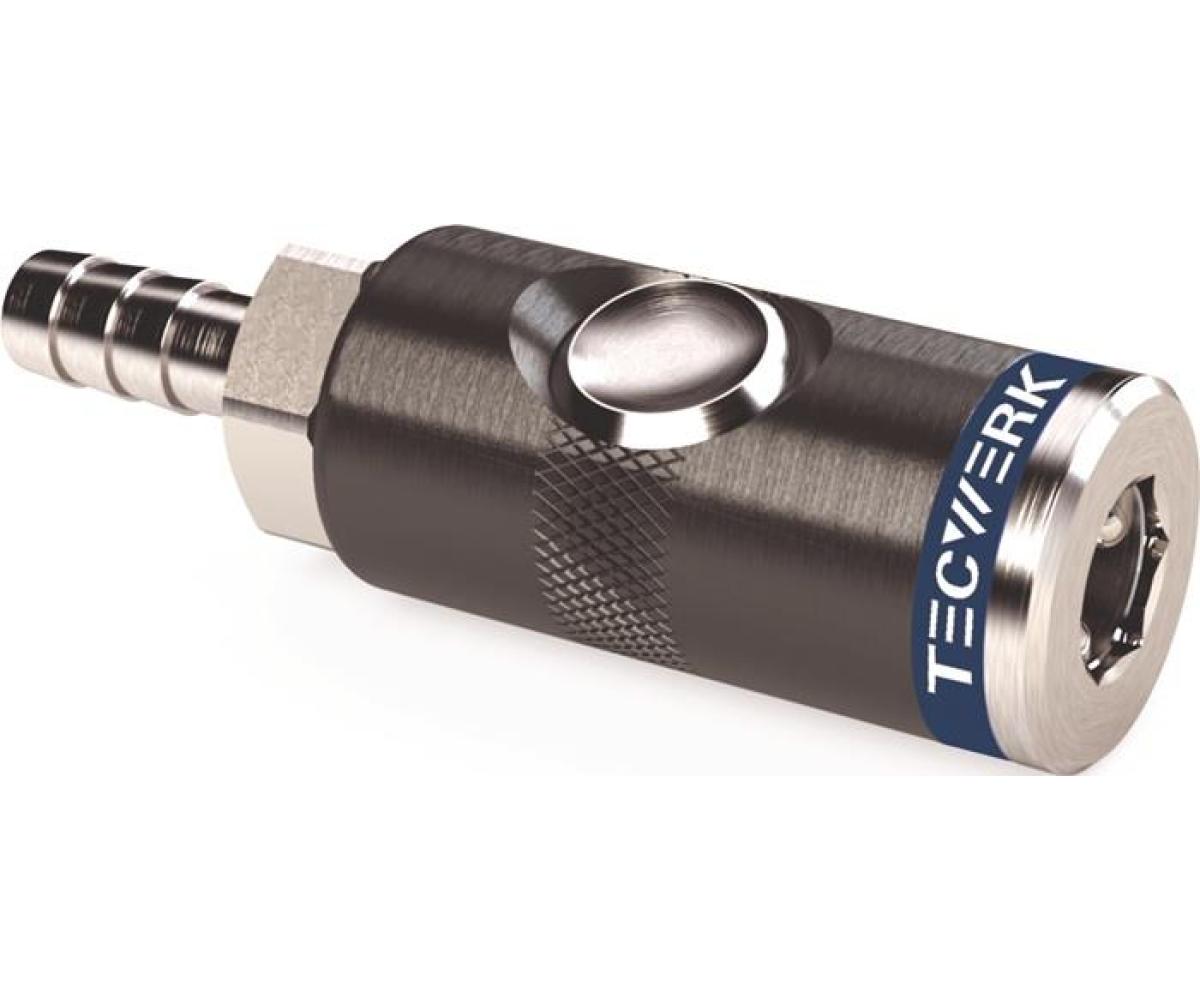 Weitere technische Eigenschaften · Durchflussmenge (Luft): 1800 (bei 6 bar, montiertem Stecker und ?p = 1 bar)l/min · Durchfluss: 1600l/min · Druckknopf-Sicherheitskup · plung DN 7,4,Tülle AluNBR · Schlauchweite LW 6 TECWERK ·