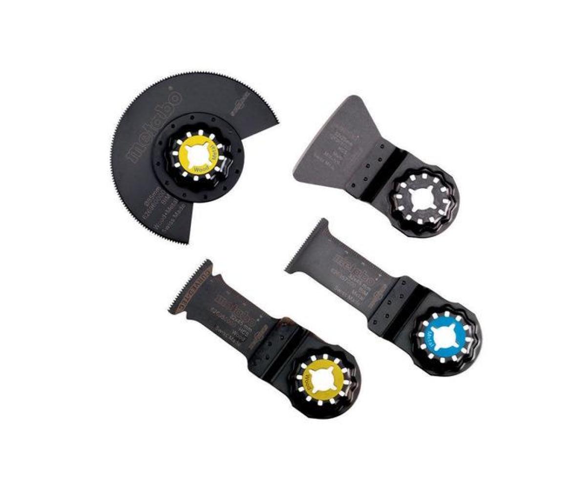 Lieferumfang: 1 x Tauchsägeblatt 32 mm HCS (Holz) · 1 x Segmentsägeblatt 85 mm BiM (Holz + Metall) · 1 x Schaber starr 52 mm HCS · 1 x Tauchsägeblatt 32 mm BiM (Metall) Starlock-Aufnahme