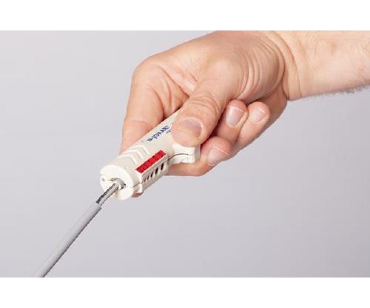 zum Abmanteln von Rundkabeln von 5 - 13 mm Ø · Abisolieren von verschiedenen Kabeltypen, z. B. IBM Typ 1, Typ 2, flexible Leitungen etc. · zum Abmanteln von PVC-isolierten Daten-, Kommunikations- und Steuerleitungen · Klingen Titan-Nitrid beschichtet, dadurch höhere Schnittgeschwindigkeit, geringerer Verschleiß, höhere Standzeit · keine Einstellung der Klingen auf die Schnitttiefe erforderlich · mit Abisoliervorrichtung für Leiter und Litzen von 0,2 - 4 mm² · Befestigungsclip zur sicheren Aufbewahrung · Gehäuse aus hochwertigem, verschleißfestem Polyamid · für Anwendungen in Handwerk und Industrie