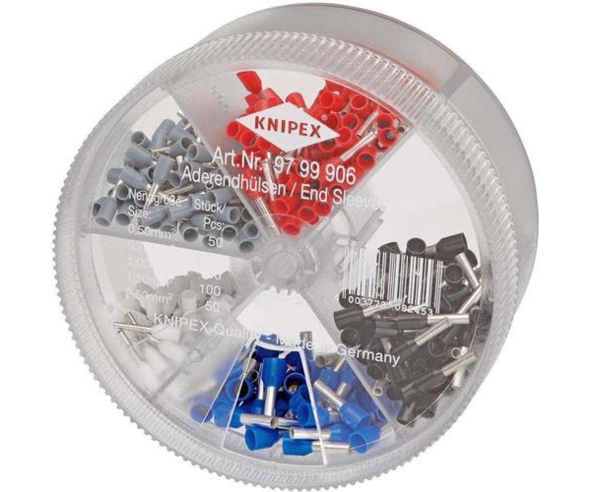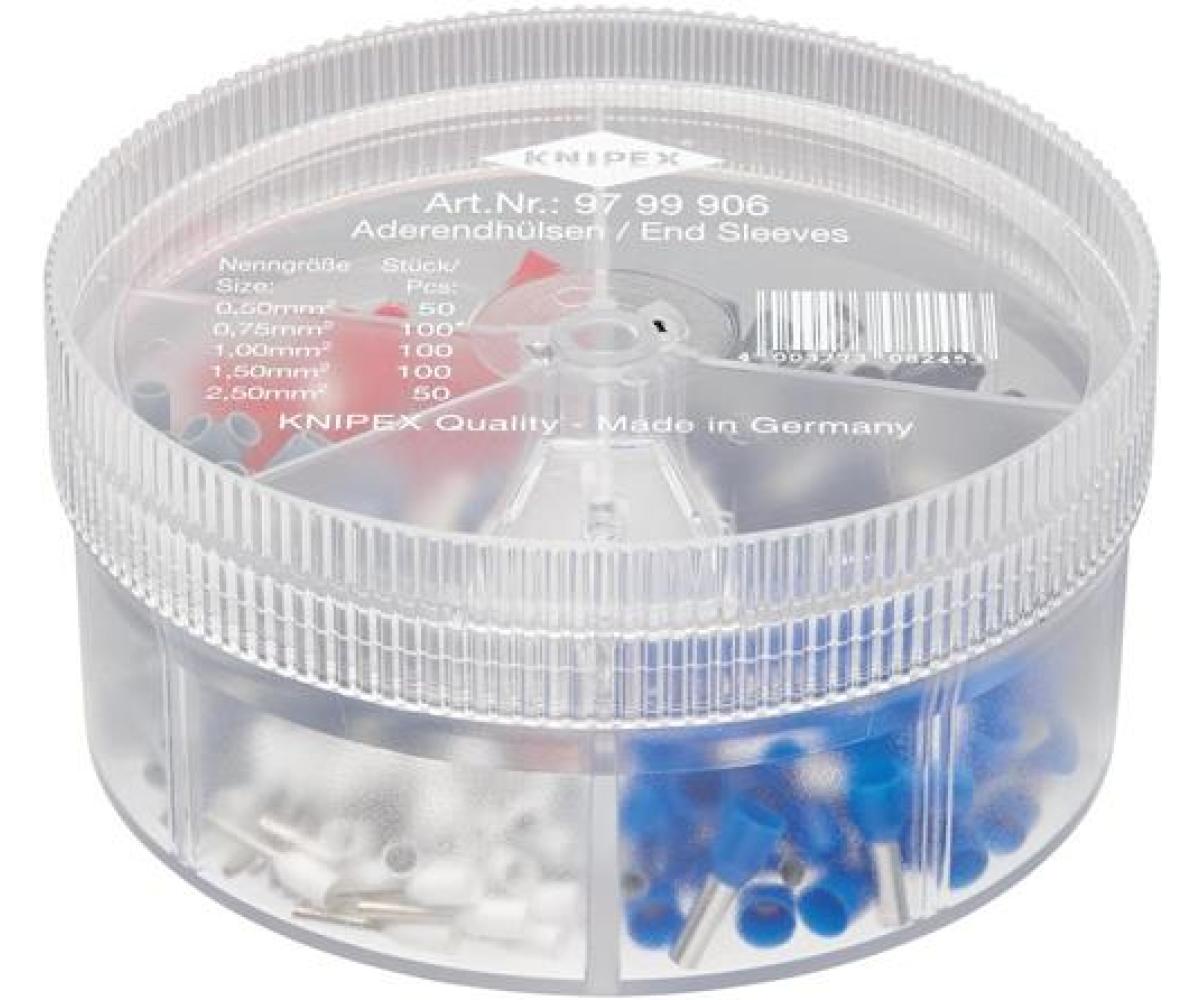 Lieferumfang: 50 x KNIPEX Aderendhülsen weiß 14 mm (50 x 0,5 mm² / AWG 20), 100 x KNIPEX Aderendhülsen grau 14 mm (100 x 0,75 mm² / AWG 18), 100 x KNIPEX Aderendhülsen rot 14 mm (100 x 1 mm² / AWG 17), 100 x KNIPEX Aderendhülsen schwarz 14 mm (100 x 1,5 mm² / AWG 15), 50 x KNIPEX Aderendhülsen blau 14 mm (50 x 2,5 mm² / AWG 13)Technische Daten