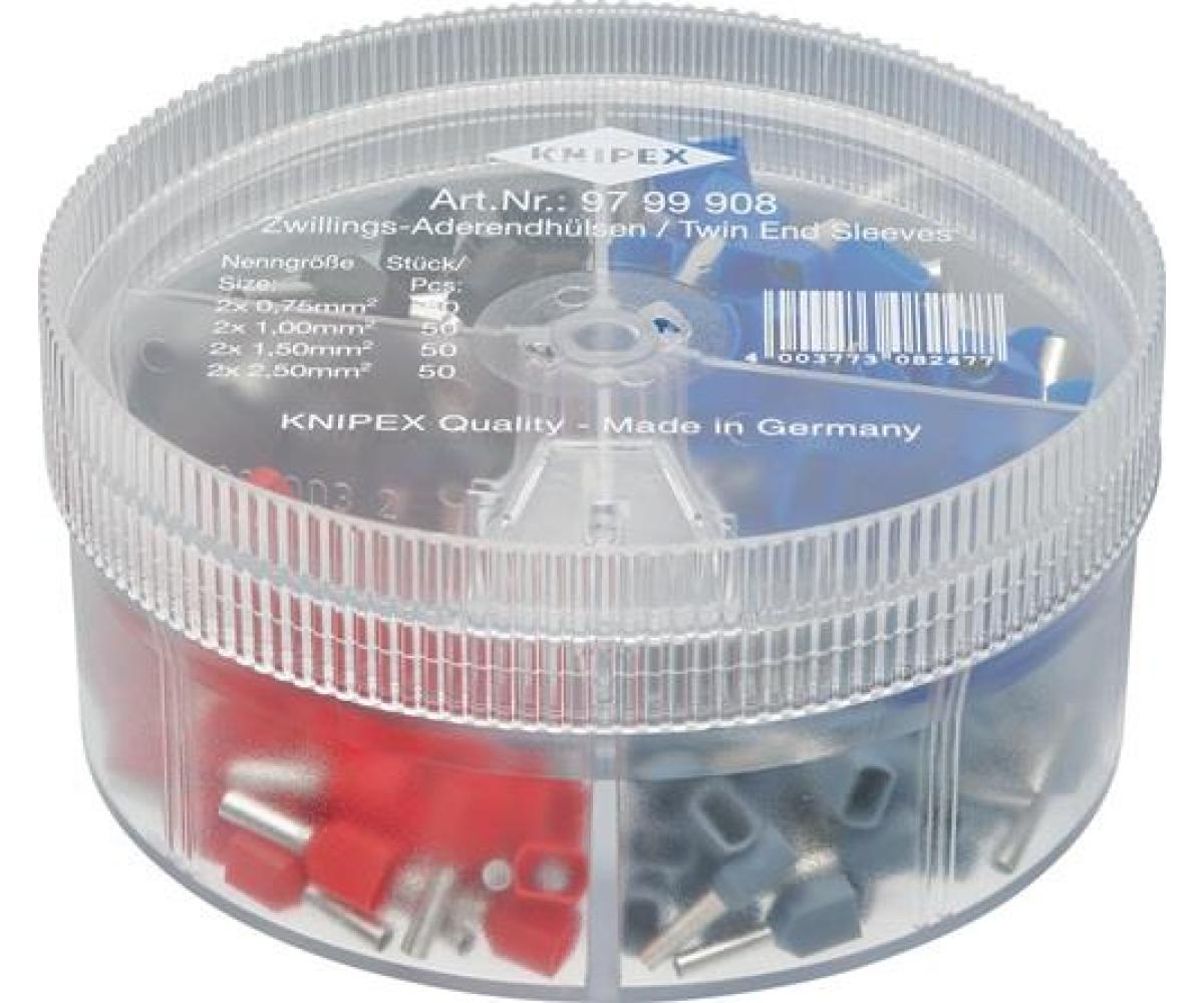 Lieferumfang: 50 x KNIPEX Twin-Aderendhülsen grau 16 mm (2 x 0,75 mm² / AWG 2 x 18) · 50 x KNIPEX Twin-Aderendhülsen rot 15 mm (2 x 1 mm² / AWG 2 x 17) · 50 x KNIPEX Twin-Aderendhülsen schwarz 18 mm (2 x 1,5 mm² / AWG 2 x 15) · 50 x KNIPEX Twin-Aderendhülsen blau 18 mm (2 x 2,5 mm² / AWG 2 x 13),Technische Daten