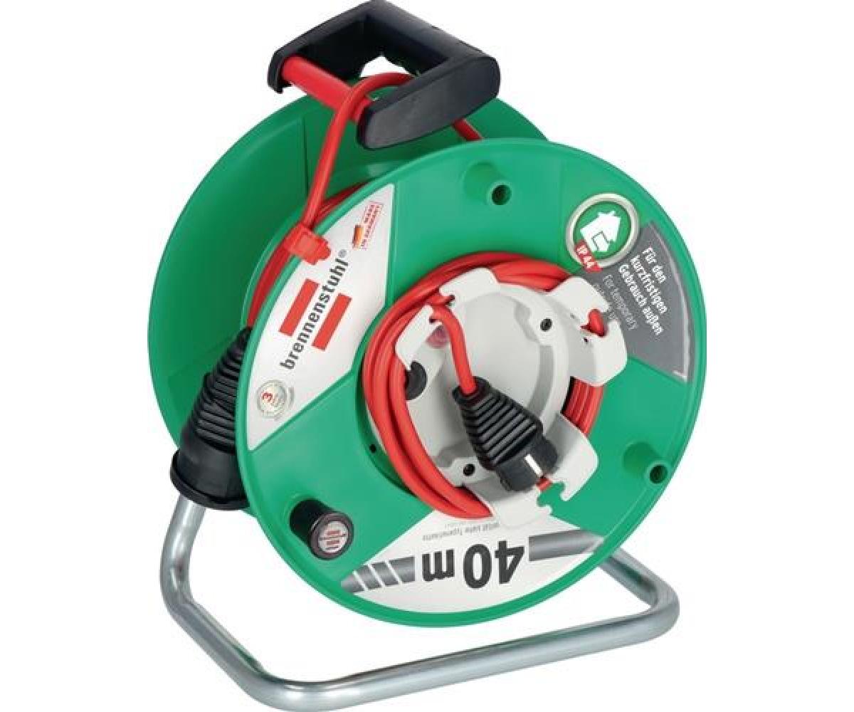 Trommelkörper aus Spezialkunststoff auf verzinketem Tragegestell · Kabelfarbe: rot · Schutzart IP 44 · Kabelbezeichnung: H05VV-F3G1,5 · ergonomischer Handgriff · Überhitzungsschutz, Kontrollleuchte bei Überhitzung und Überlastung · für kurzzeitige Verwendung im Freien