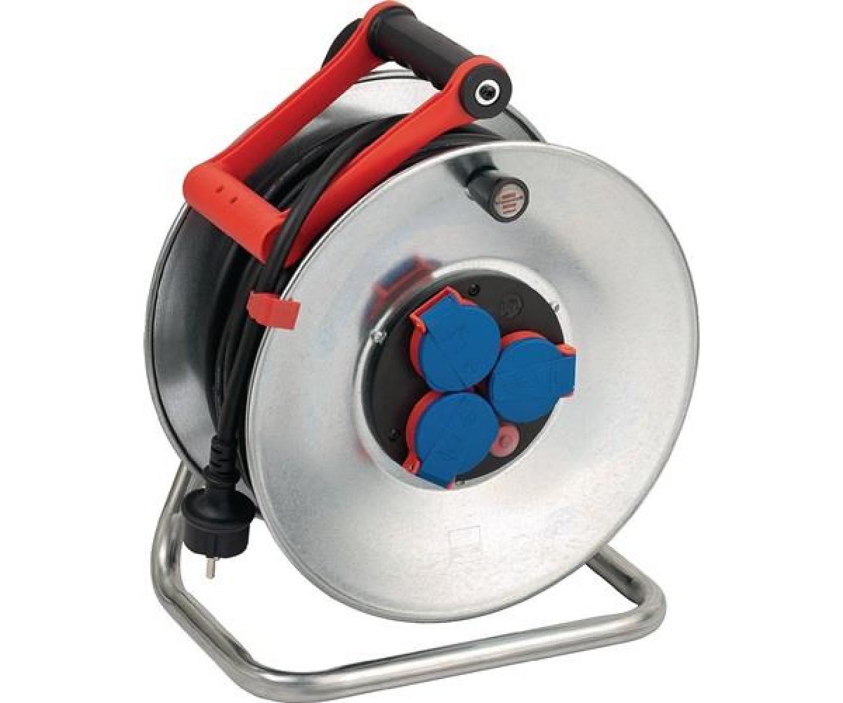 Trommelkörper aus rostgeschütztem, verzinktem Stahlblech Ø 290 mm · stabiles Tragegestell · innovativer Tragegriff "cablepilot" für perfekte Kabelführung · pendelt auf beiden Seiten und ermöglicht bequemes Tragen und Aufhängen · mit Drehgriff für komfortables Aufrollen · 3 spritzwassergeschützte Schutzkontakt-Steckdosen 230 V mit selbstschließenden Klappdeckeln · mit Überhitzungsschutz und Kontrollleuchte