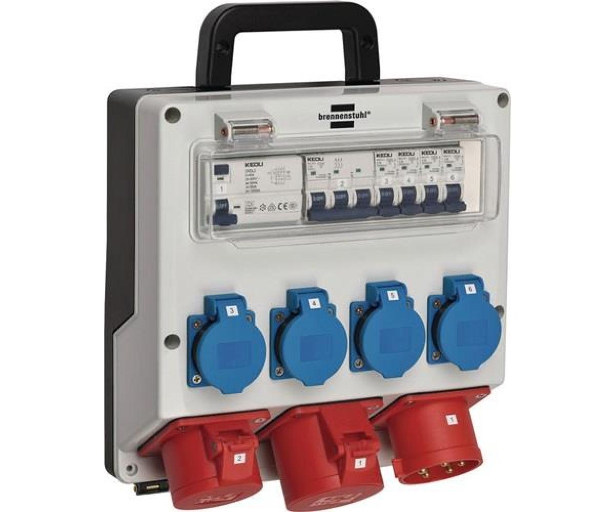 robustes, bruch- und schlagfestes Kunststoffgehäuse · zur stabilen Wandbefestigung geeignet · mit ergonomisch geformtem Tragegriff für bequemen Transport · Schutzabdeckung für Sicherungen · mit FI-Personenschutz-Schalter 30mA für mehr Sicherheit · Schutzkontakt-Steckdosen 230 V auf allen 3 Phasen verteilt