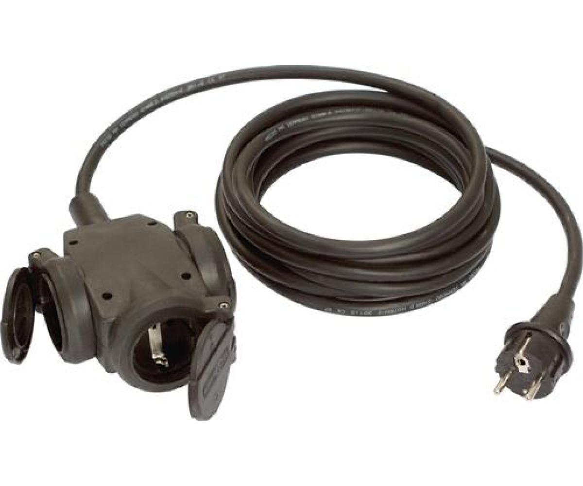 Gummi-Verlängerung· 3-fach-Kupplung · Schutzkontaktstecker und 3-fach Verteilersteckdose Gummi mit Klappdeckel· im Folienbeutel · IP44 · geprüft nach VDE 0620-1, VDE 0285-525-2-21