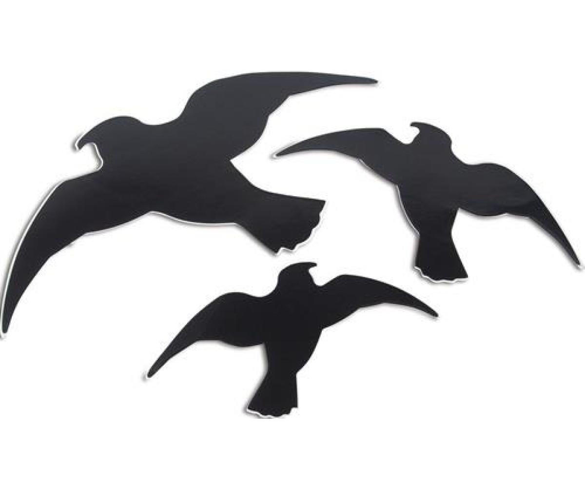 selbstklebende Silhouette warnt Vögel vor großen transparenten Flächen · auf stark spiegelnde Glasscheiben, große Fensterflächen, Verglasung von Wintergärten aufkleben · witterungs- & UV-beständig · schwarz · 3 Stück in 3 Größen