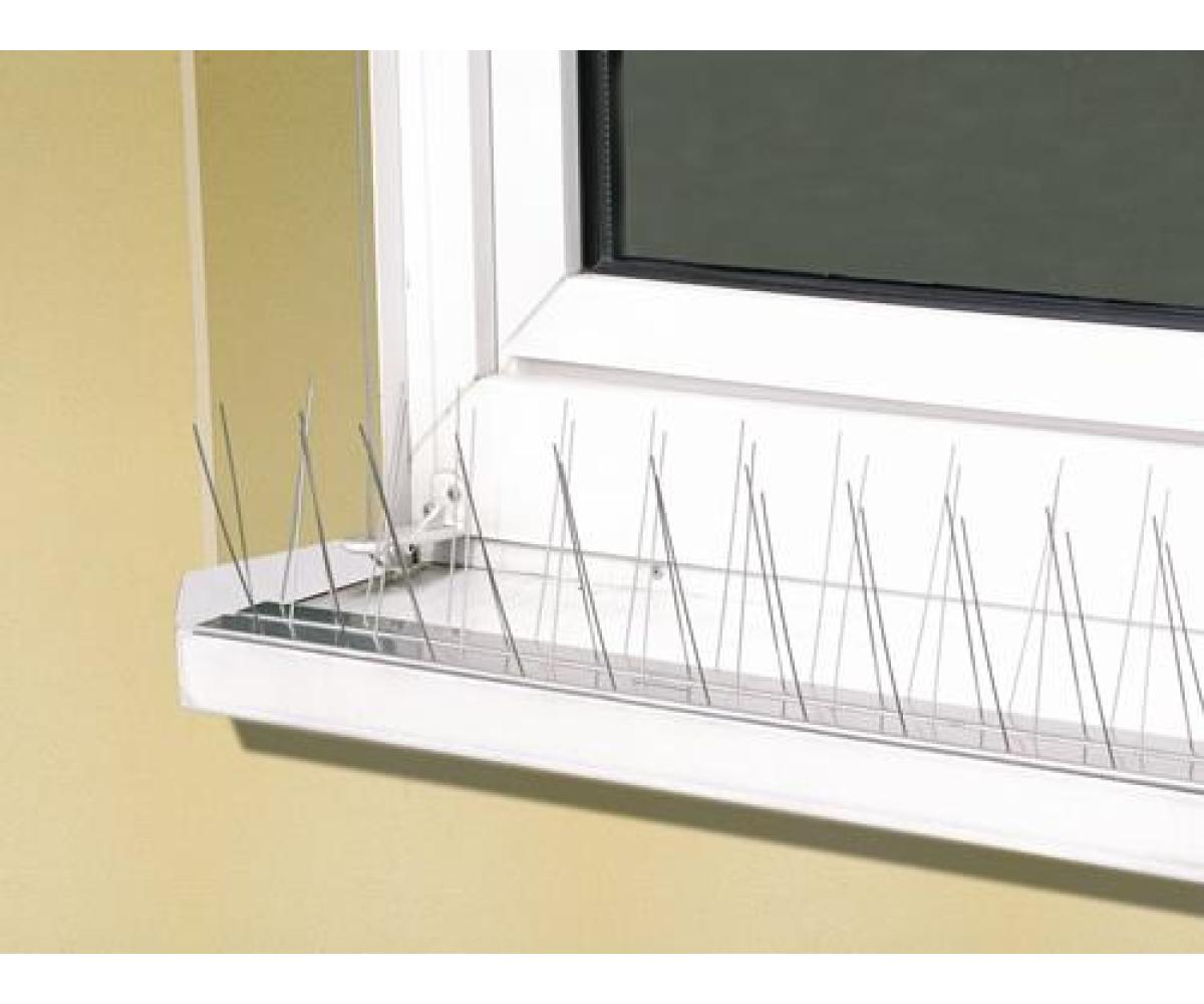 zuverlässige Abwehr von Tauben und anderen Vögeln · Schutz vor Vogelkot · 60 cm langes Aluminium-Profil, 11 cm breit sowie 24 Edelstahl-Spikes · Befestigung auf Beton, Marmor, Holz, etc. · Profil individuell kürzbar und langlebig · inklusive Befestigungsmaterial: Schrauben und Dübel