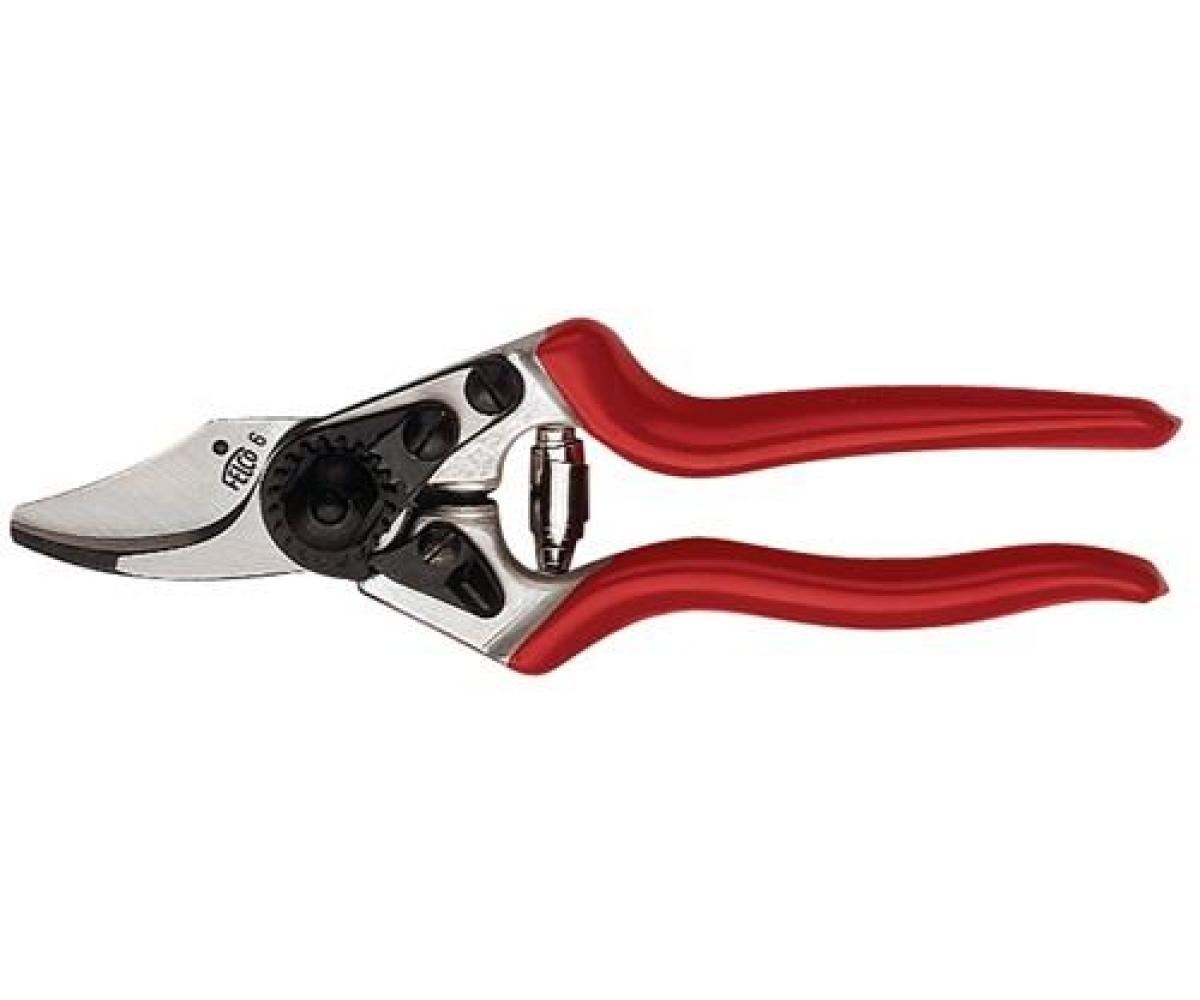 empfohlen für alle Arten von Schnitt und für mittlere Hände · Griffe mit Puffer und Stoßdämpfer aus Gummi, zur Schonung des Handgelenks · spitz zulaufender Schneidkopf für beste Handhabbarkeit · gezahnte Mutter zur einfachen und genauen Nachregelung des Spiels zwischen Klinge und Gegenklinge, für einen sauberen und präzisen Schnitt · Klinge mit Drahtabschneider · verschraubte Gegenklinge mit Saftrille · Griffe aus geschmiedeter Aluminiumlegierung