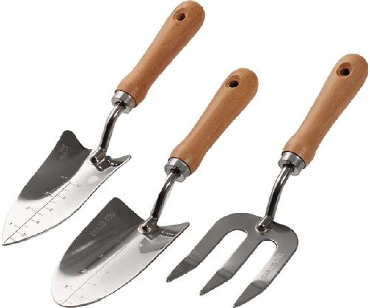 ideal für die Bepflanzung oder Umpflanzung im Garten oder auf dem Balkon · Set besteht aus einer Pflanzkelle, einer Kelle und einer Pflanzgabel · hergestellt aus rostfreiem Stahl mit Holzgriffen Gartenwerkzeugset · 3-tlg.NOW ·