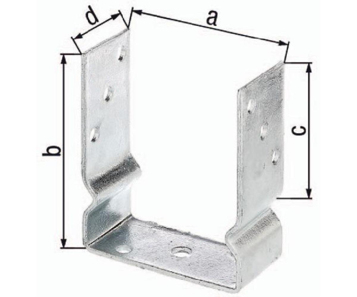Weitere technische Eigenschaften · Oberfläche: feuerverzinkt · Maß c: 100mm · Maß d: 60mm · Material: Stahl roh · Maß a: 71mm · Maß b: 150mm · U-Pfostenträger · ETA-10/0210 · 71x150x100x60mm TZN ·