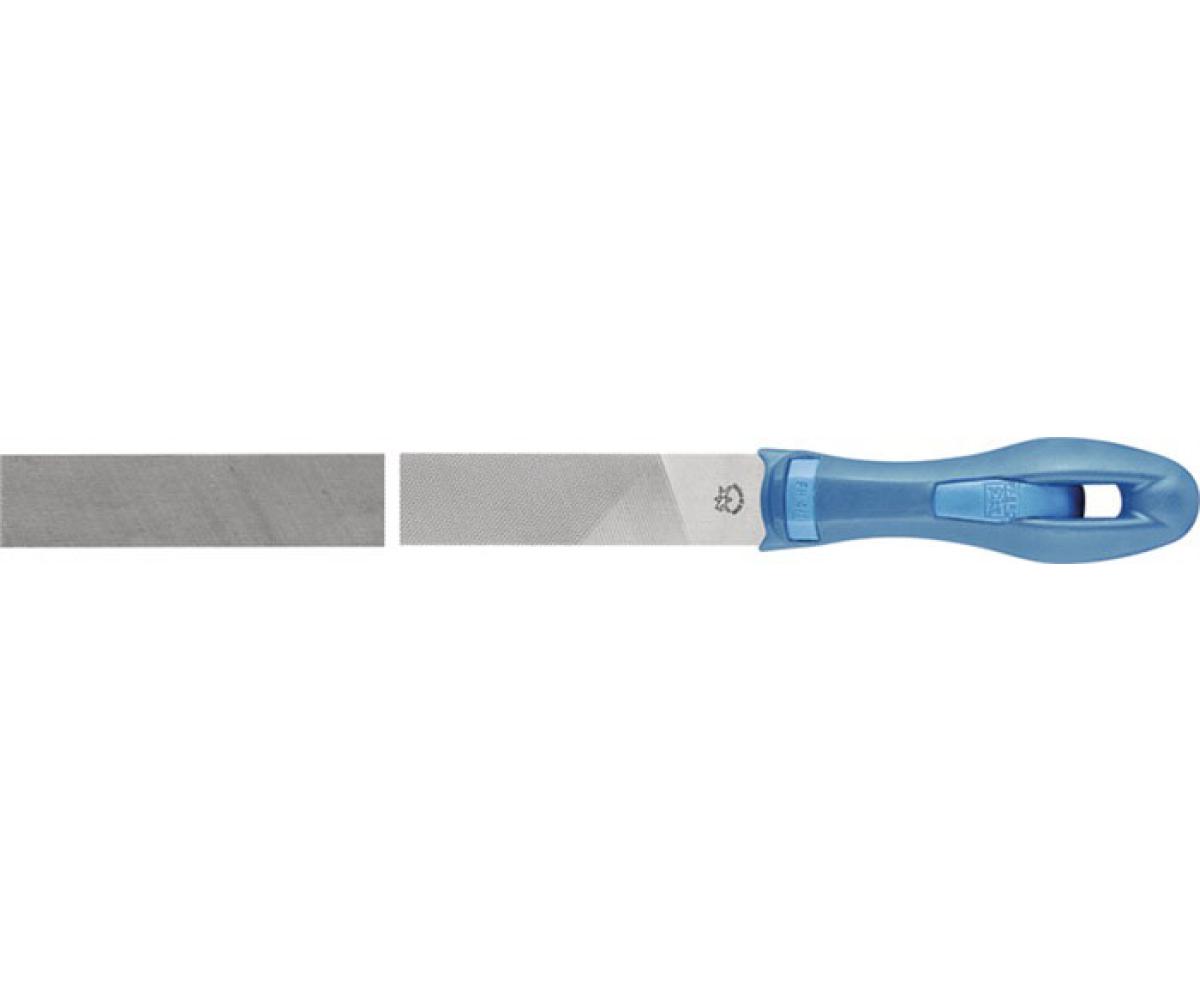mit Ergonomie-Feilenheft · rechteckige Feile mit unterschiedlichen Hieben auf drei Seiten · Kreuzhieb auf Vorderseite zum Schruppen · Einhieb 2 auf Rückseite und Kante zum Schärfen · für Entgraten, Flächenbearbeitung, Kantenbearbeitung, Schärfen und Schlichten von Stahl und Stahlguss · hoher Griffkomfort · kein Wegrollen der Feile