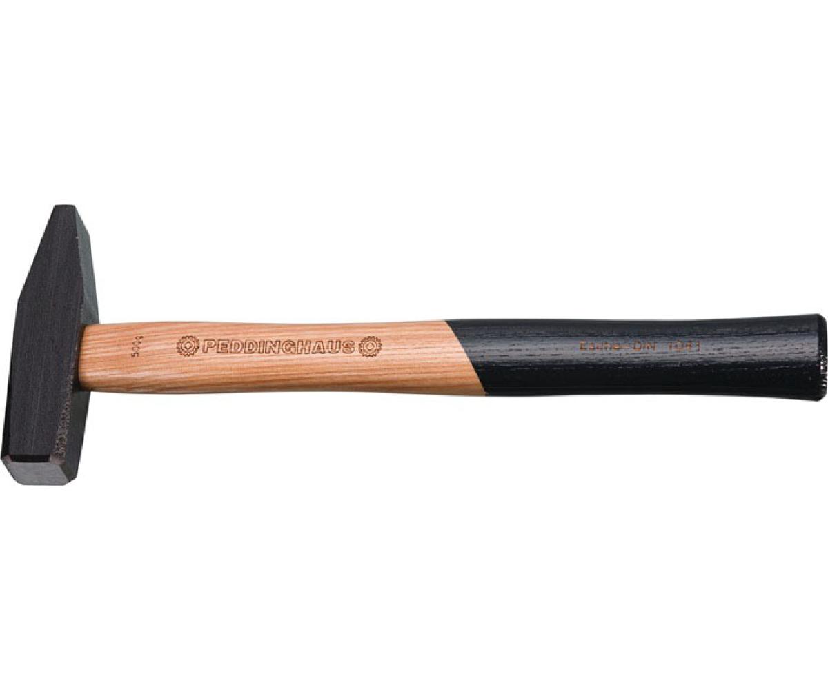 DIN 1041 · Hammer in Gesenk geschmiedet · Bahn und Pinne sorgfältig gehärtet und angelassen · Bahnkanten gebrochen · Pulverlackierung · Arbeitsfläche blank · Stiel mit Stahlringkeil gesichert · mit geschweiftem Hickorystiel