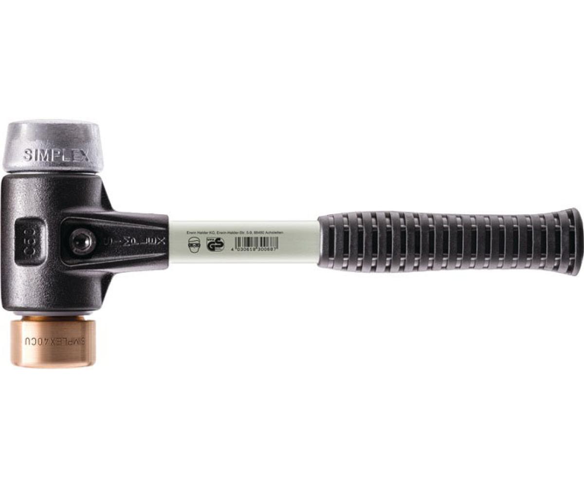 2-teiliges Spanngehäuse aus verstärktem Temperguss, schwarz · Fiberglasstiel mit rutschsicherem Gummigriff · Schlageinsätze und Simplex-Stiel sind leicht auswechselbar durch Lösen bzw. Spannen der Innensechskant-Spannschraube · Schlagköpfe, für sehr hohe Schlagkraft mit je 1 Stück Kupfer mit Kunststoffhülse, hart und Weichmetall silber, hart