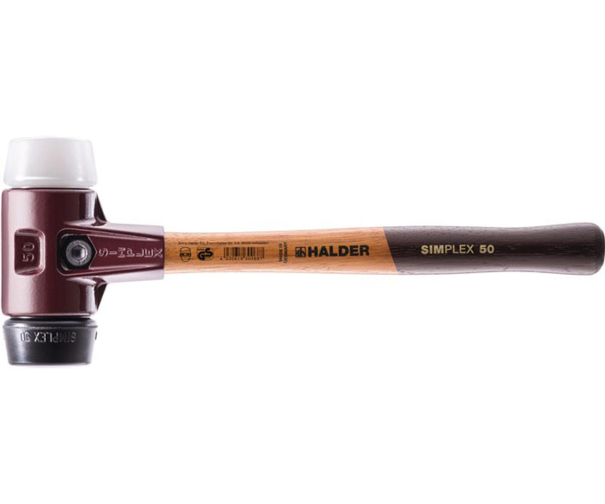 Weitere technische Eigenschaften · Einsätze: Gummi schwarz/Superplastik weiß · Schlag: mittelhart · Stiel: Holz · Schonhammer SIMPLEX · L.405mm · Kopf-D.60mm mittelh.HO · weiß HALDER ·