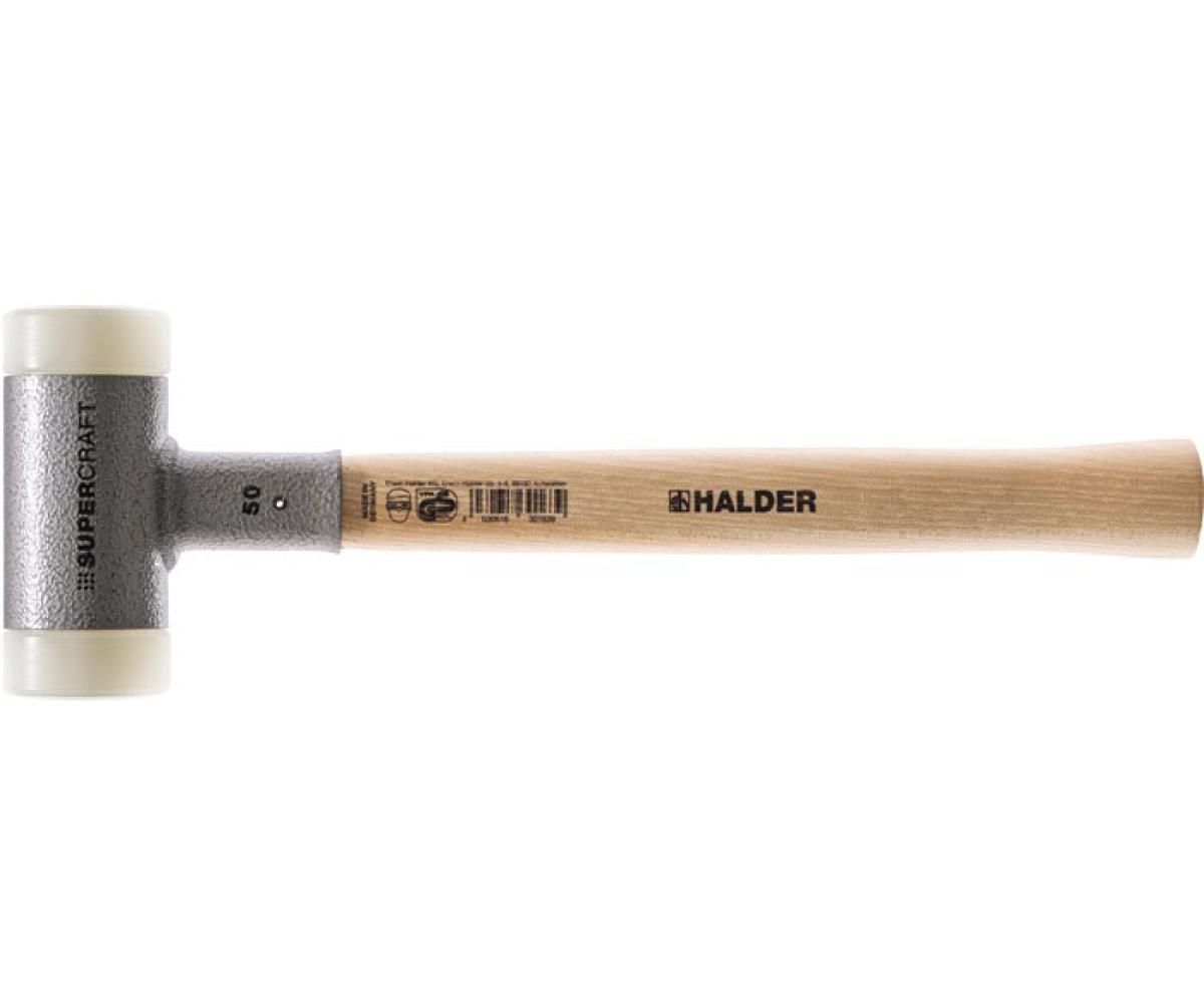 Weitere technische Eigenschaften · Länge: 330mm · Gewicht: 460g · Kopflänge: 110mm · Einsätze: Nylon weiß · Schlag: hart · Stiel: Hickory · Schonhammer SUPERCRAFT · L.330mm Kopf-D.30mm · Hickory rückschlagfrei ·