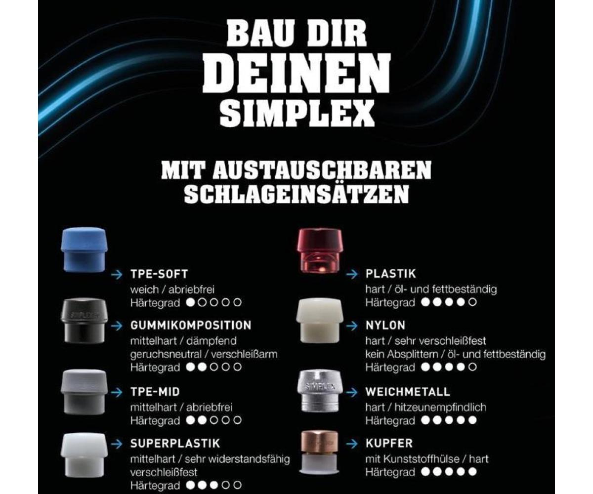 2-teiliges Spanngehäuse aus Aluminium · Schlageinsätze und Simplex-Stiel sind leicht auswechselbar durch Lösen bzw. Spannen der Innensechskant-Spannschraube · Schlagköpfe abriebfrei · extra leich, dank Aluminiumgehäuse · je 1 Stück überdimensionale Einsätze aus TPE-Soft, blau (weich) und Superplastik, weiß (mittelhart)