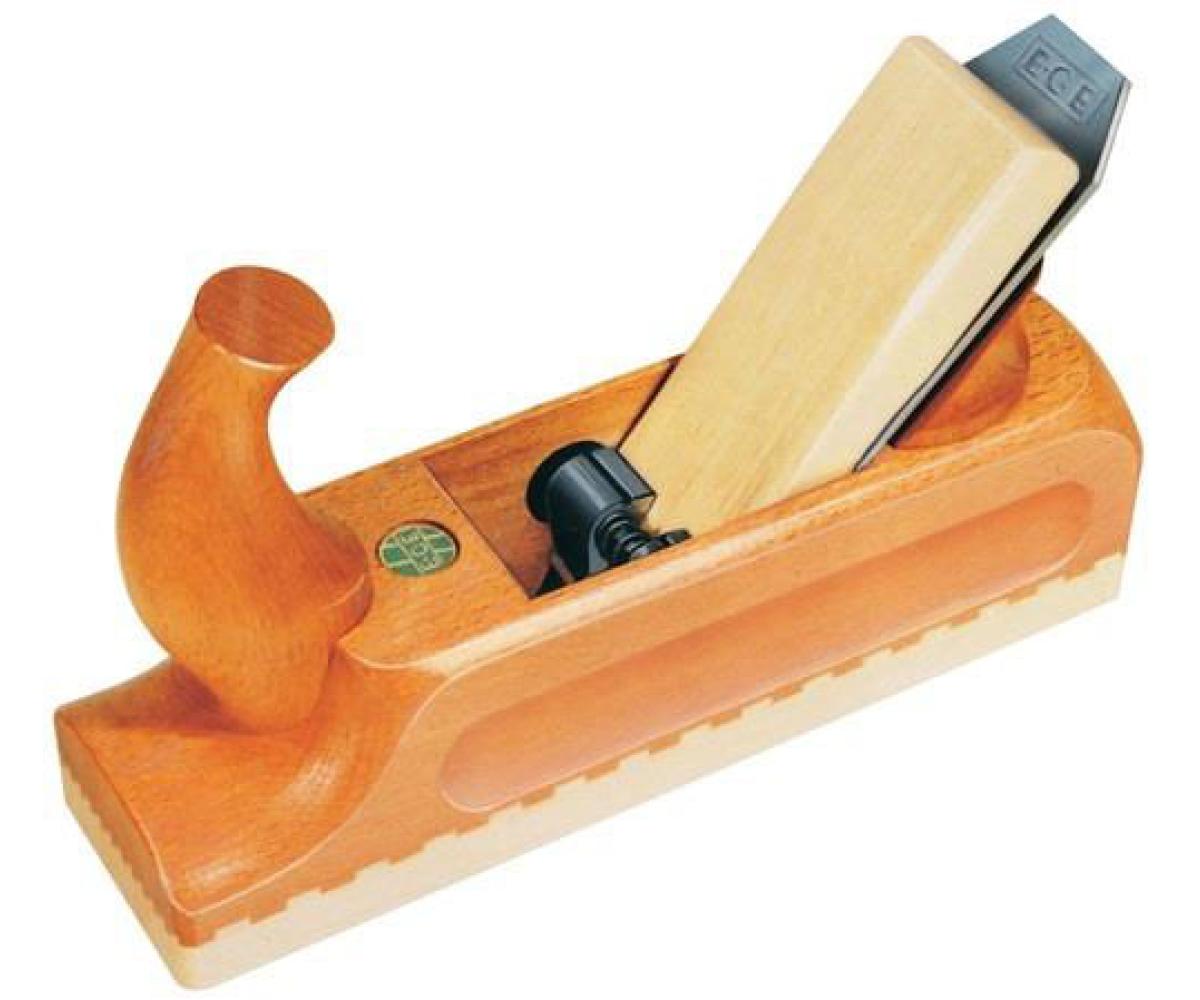 Hobelkörper aus gedämpftem Rotbuchenholz · mit in schräg verlaufenden Nuten aufgeleimter, verschleißfester Weißbuchensohle · fein lackiert · drehbares integriertes Keilwiderlager · Hobeleisen gebrauchsfertig geschärft und abgezogen · mit Handschutz und Schlagknopf