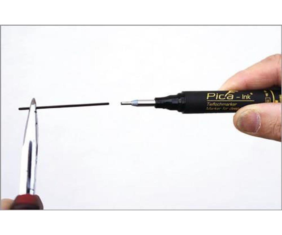 ideal für Bohrungen und andere schwer zugängliche Stellen · für fast alle trockenen Oberflächen · permanente Tinte auf Alkoholbasis, mit Alkohol/Spiritus von glatten flächen entfernbar · selbstnachstellende, patentierte Edelstahl-Teleskopspitze (bis zu 3-fache Schreibleistung) · Faserspitze um 180 Grad drehbar (deutliche Verlängerung der Lebensdauer)