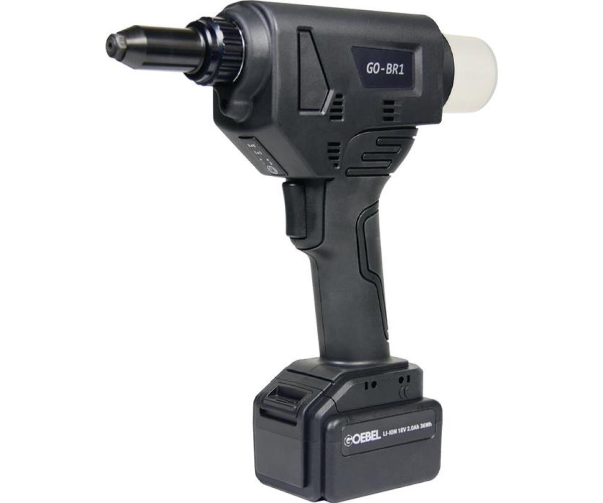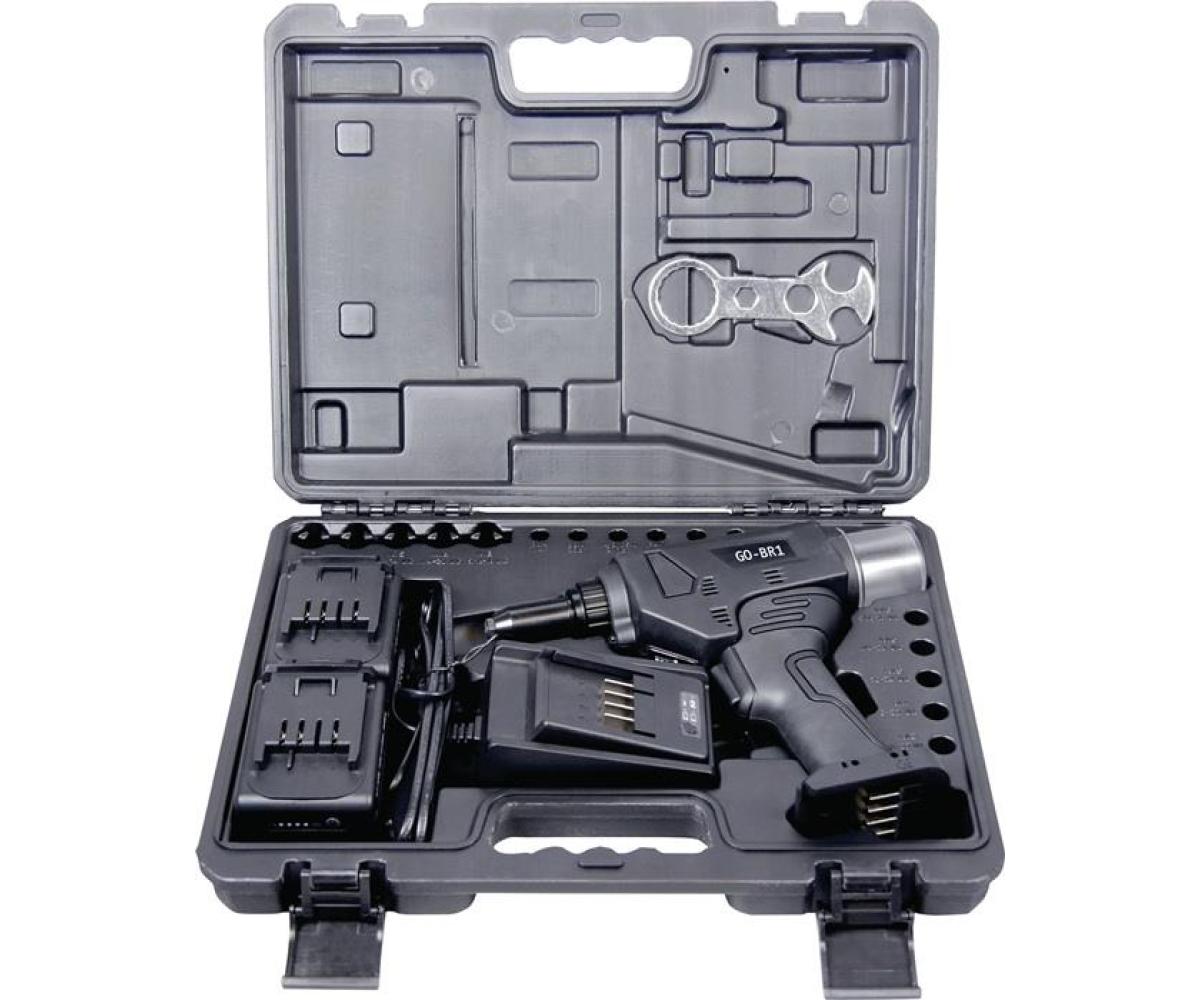 Weitere technische Eigenschaften · Gewicht (mit Akku): 1,4kg · Akku: Lithium · Gerätehub: 21mm · Zubehör: Werkzeugschlüssel · Höhe: 250mm · Lieferung: im Kunststoffkoffer · Länge: 247mm · Setzhub: 15/21mm · prüfpflichtig: ja · Akkublindnietsetzgerät · GO-BR1 8-tlg.12.000N im · Ku.-Koffer ·
