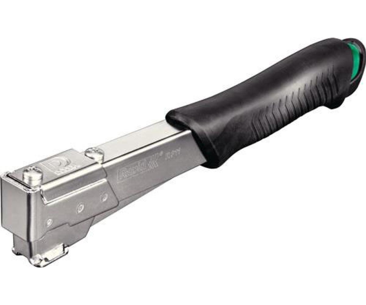 robust · mit einfachem und zuverlässigem Ladesystem für Klammern von 6 bis 12 mm Länge · eine spezielle Prallplatte verhindert die Beschädigung des Materials · ideal für das Befestigen von Isoliermaterial, Dachpappe, Teppichböden, Etiketten, etc. · einfach und mühlos von unten zu laden · Magazinkapazität: 2 Klammernstäbe