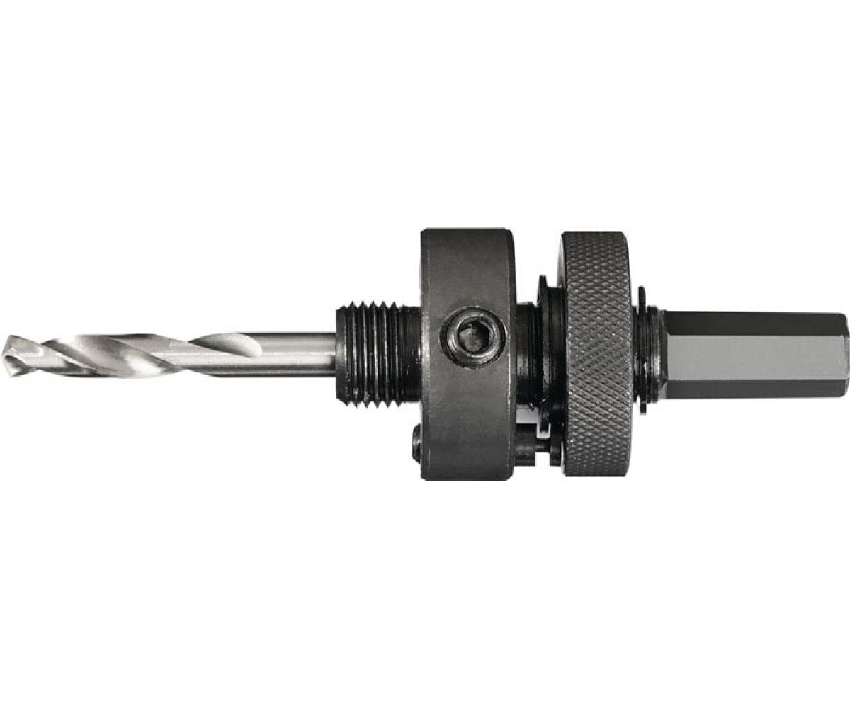 die Aufnahmen für die Lochsägen werden jeweils mit einem 6,35 mm (1/4")-Führungsbohrer geliefert · eine Feststellschraube ermöglicht die Veränderung der Position des Führungsbohrers