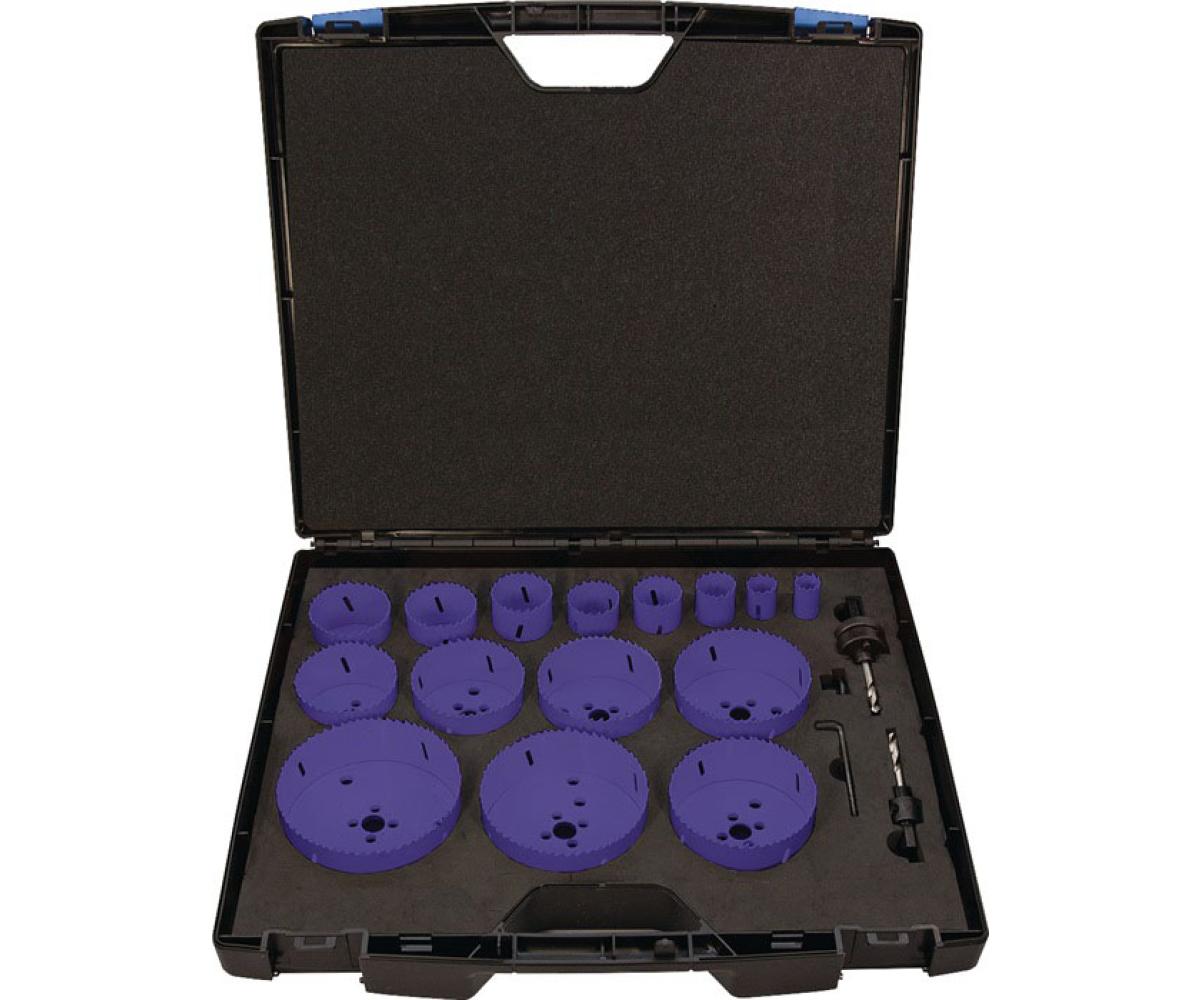 Weitere technische Eigenschaften · Verpackung: Koffer · Lochsägensatz · 17-tlg.19-114mm · Schnitt-T.38mm HSS-Co8 · Inhalt: je 1 Lochsäge Ø 19, 22, 29, 35, 38, 44, 51, 57, 68, 76, 83, 92, 95, 105 und 114 mm Jeder Satz inkl. je 1 Aufnahmeschaft in den Größen 9,5 und 11 mm je 1 Ersatzspiralbohrer ·