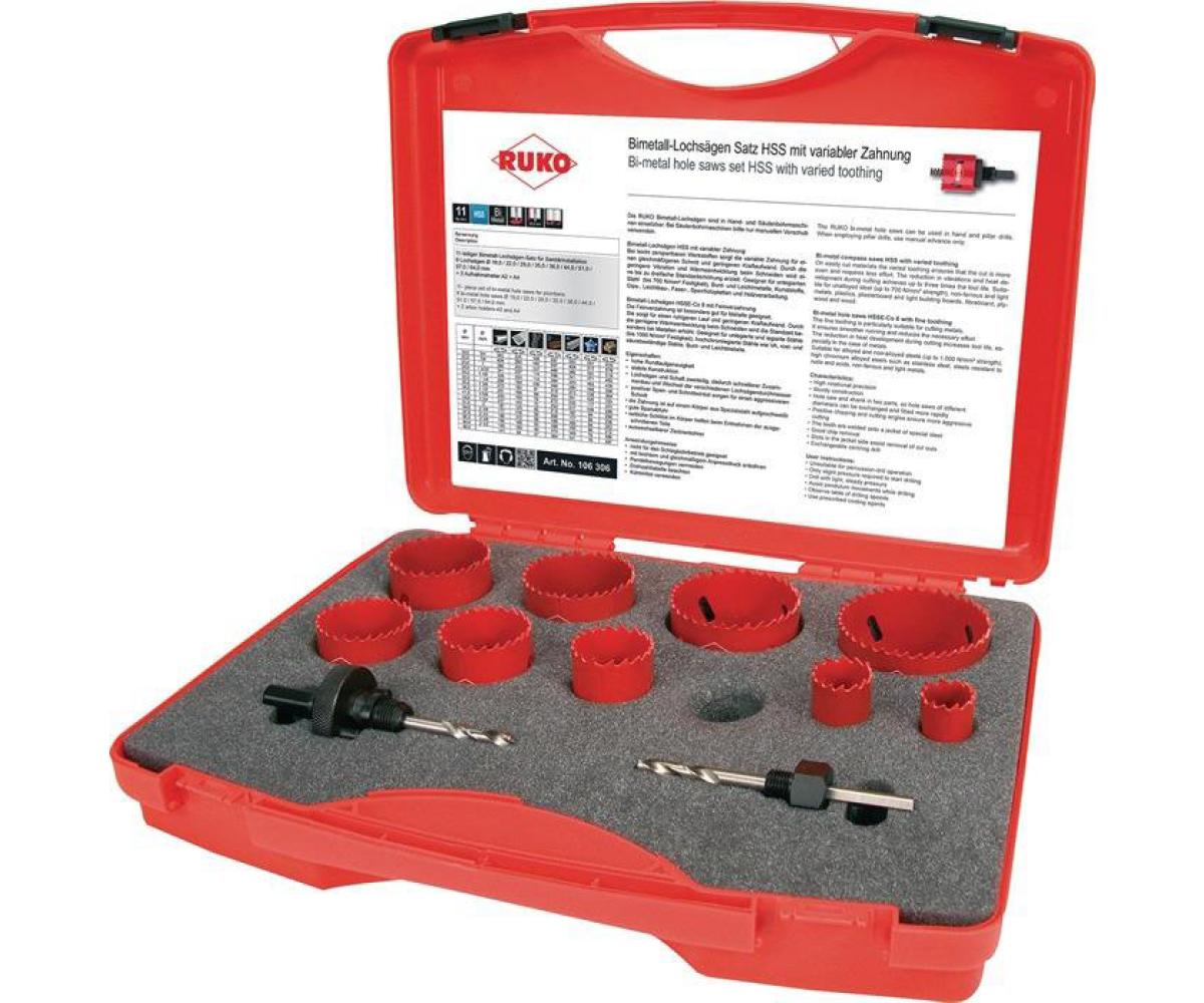 Sanitär · HSS-Bi-Metall · sind in Hand- und Säulenbohrmaschinen einsetzbar · bei Säulenbohrmaschinen nur manuellen Vorschub verwenden · Schnitttiefe 38 mm Inhalt: je 1 Lochsäge Ø 19, 22, 29, 35, 38, 44, 51, 57 und 64 mm 2 Aufnahmehalter A2 und A4