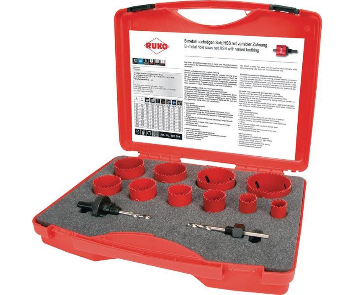 Sanitär · HSS-Bi-Metall · sind in Hand- und Säulenbohrmaschinen einsetzbar · bei Säulenbohrmaschinen nur manuellen Vorschub verwenden · Schnitttiefe 38 mm Inhalt: je 1 Lochsäge Ø 22, 25, 32, 35, 41, 44, 51, 54, 60 und 68 mm 2 Aufnahmehalter A2 und A4
