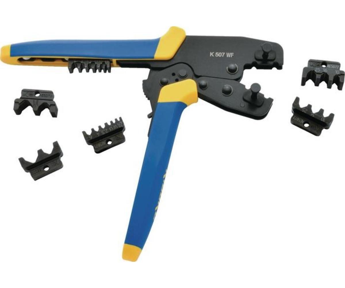 mit auswechselbaren Presseinsätzen für Aderendhülsen · großer Querschnittbereich von 0,5 - 50 mm² · ein Pressprofil für alle gängigen Leiter · schnelles und einfaches Auswechseln der Presseinsätze · weniger Pressungen aufgrund optimaler Einsatzbreite · mit Sperrvorrichtung für gleichmäßig kontrollierte Pressergebnisse · Justierscheibe zum Ausgleich des natürlichen Werkzeugverschleißes